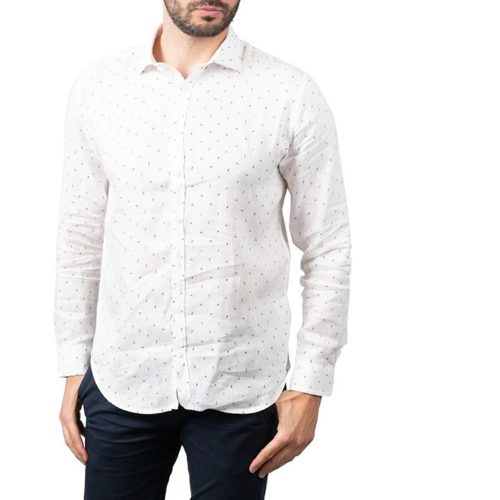 Ανδρικό λινό πουκάμισο OCEAN SHARK σε λευκό χρώμα, με εκτύπωση. Έχει μακρυά μανίκια και άνετη κλασσική γραμμή.