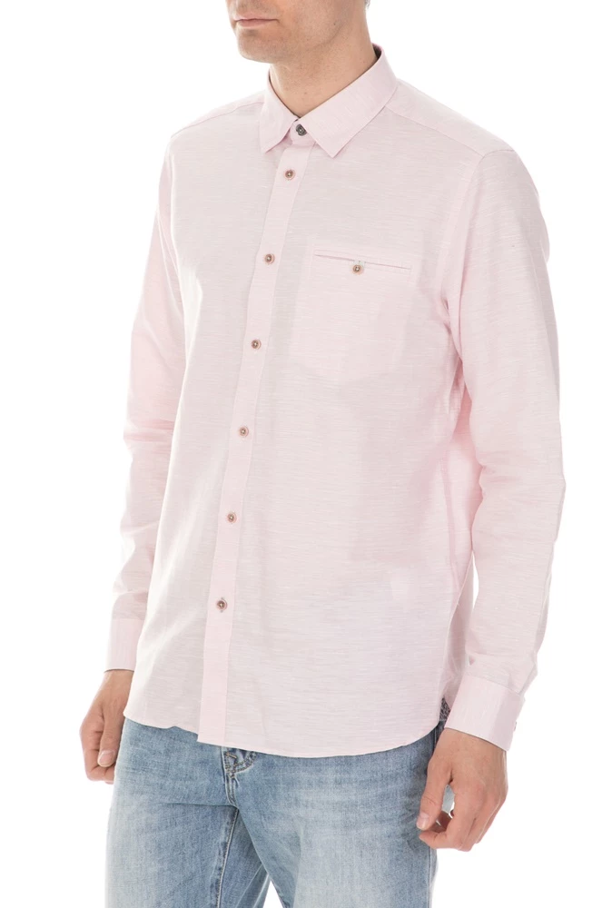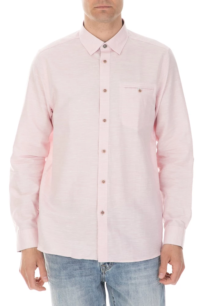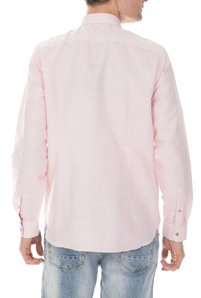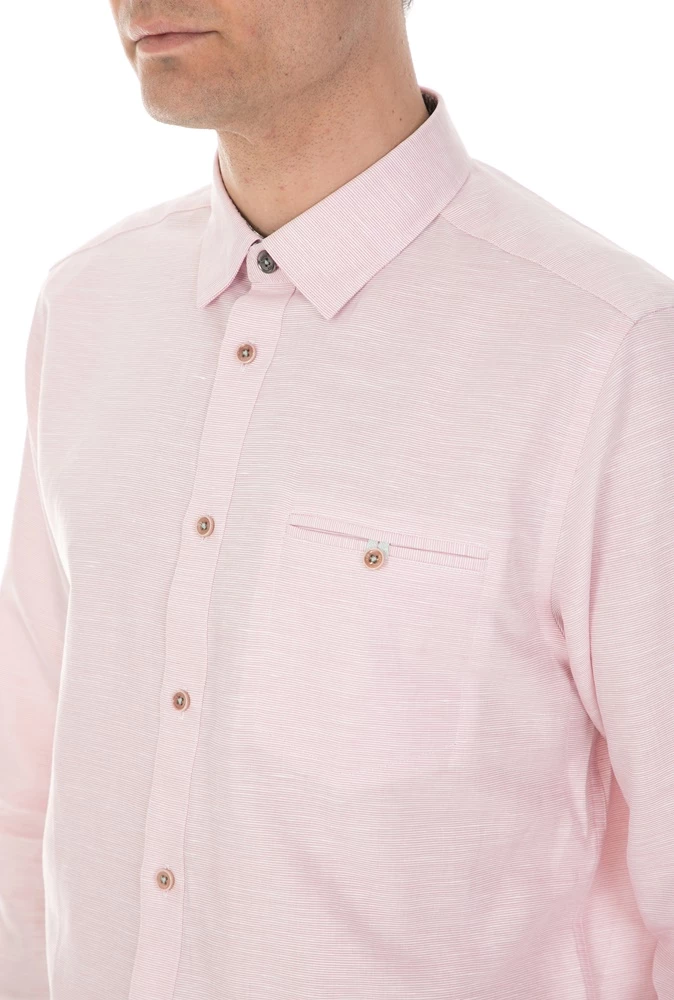 Ανδρικό μακρυμάνικο πουκάμισο σε ροζ απόχρωση με διακριτικές ρίγες.. Έχει κανονικη γραμμή και κλασικό γιακά. Basic κομμάτι για all day εμφανίσεις.