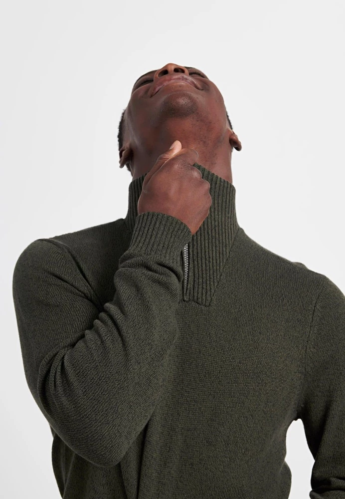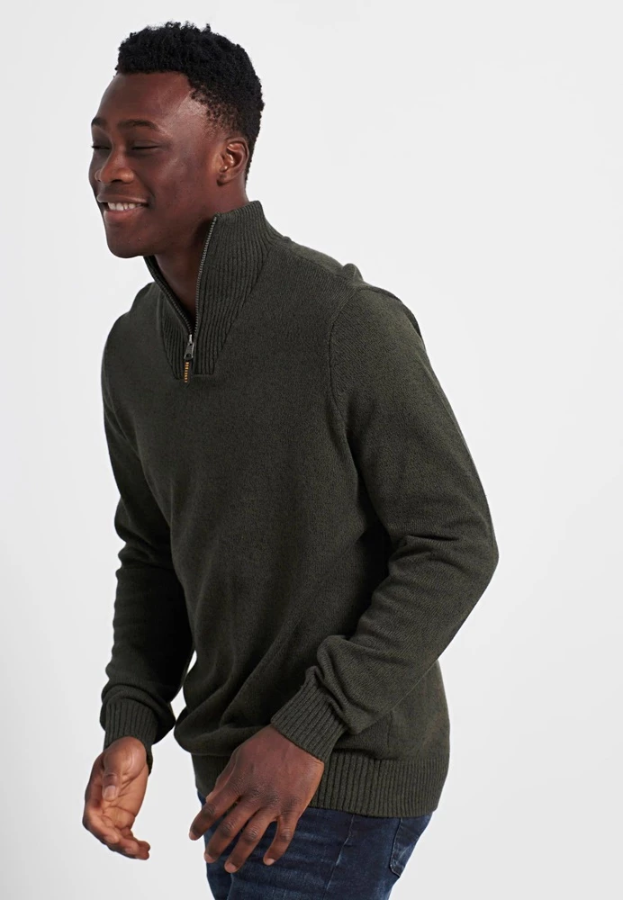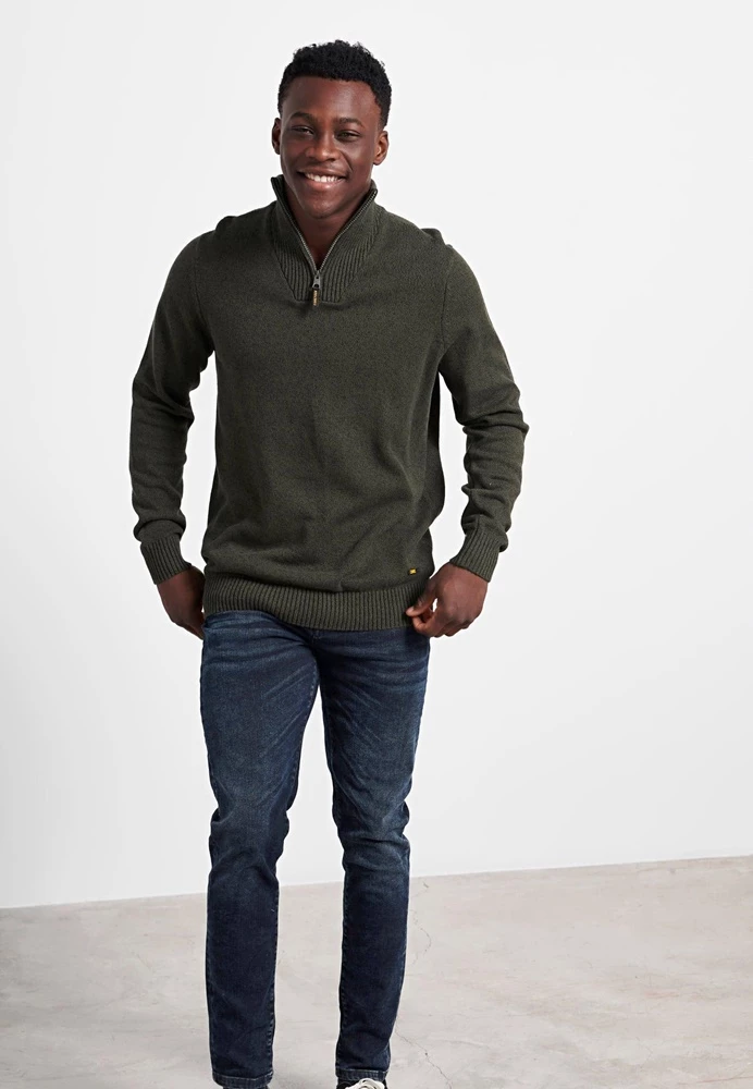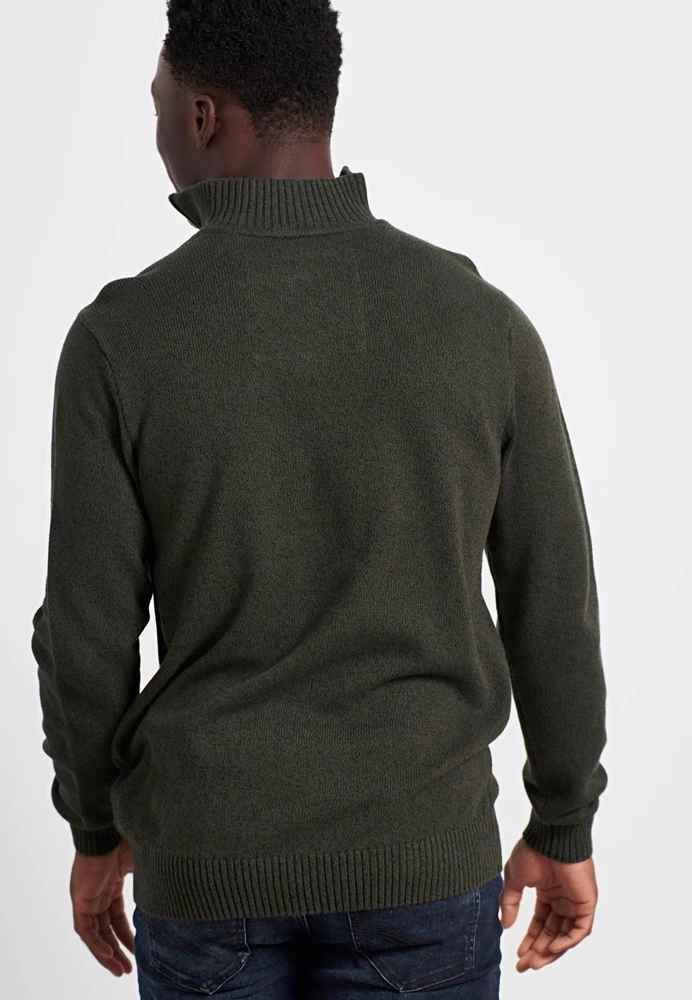 Ανδρικό πλεκτό FUNKY BUDDHA σε χακί χρώμα. Σε ίσια γραμμή, από βαμβακερή πλέξη. Έχει μακριά μανίκια και όρθια λαιμόκοψη με φερμουάρ. Λάστιχο ριμπ στις μανσέτες και στην βάση.