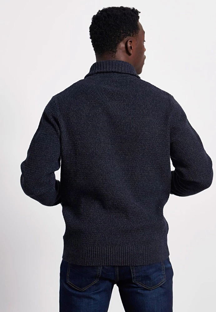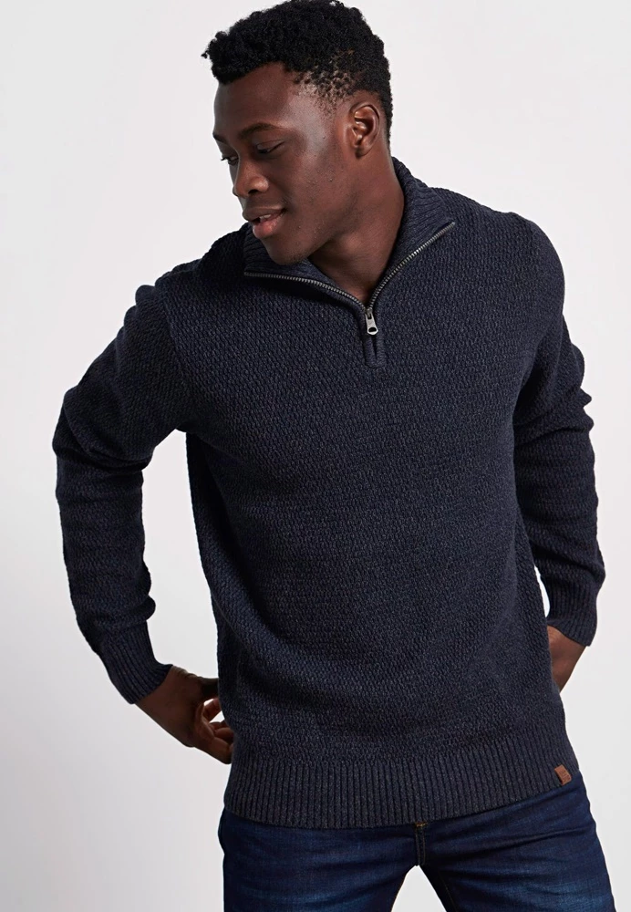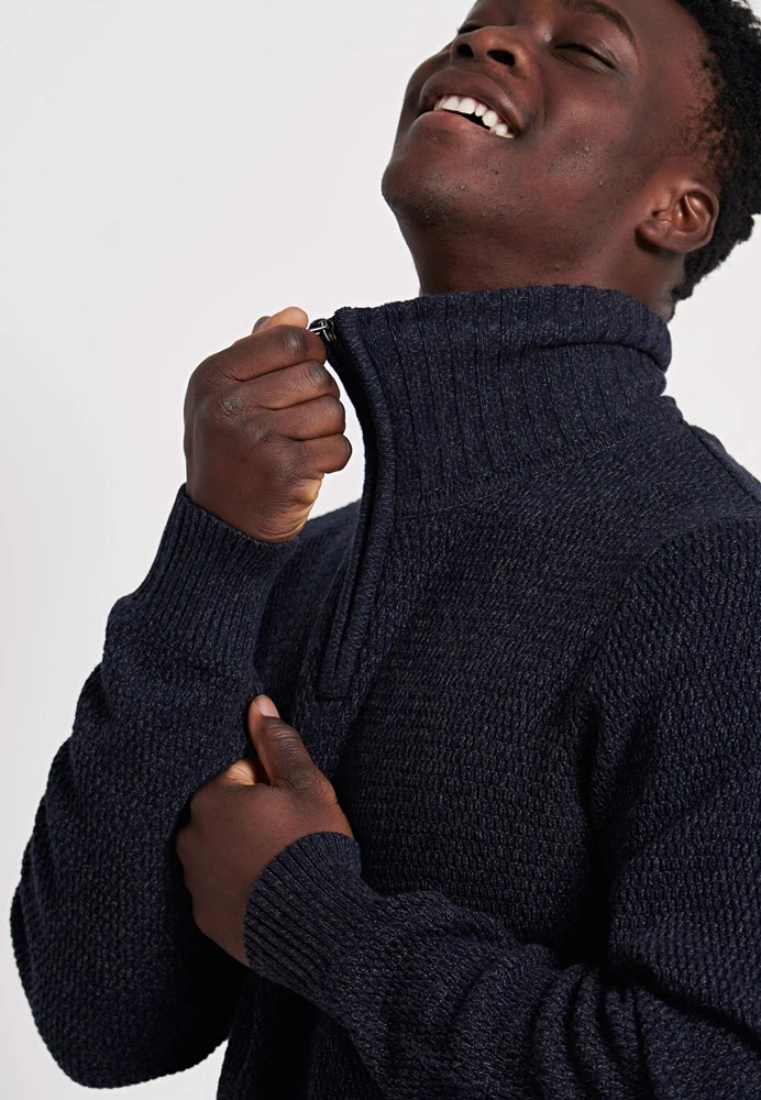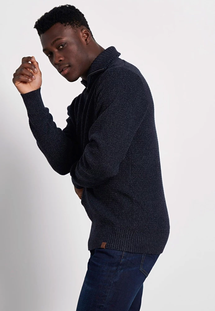 Ανδρικό πλεκτό FUNKY BUDDHA σε μπλε απόχρωση. Σε ίσια γραμμή, από βαμβακερή πλέξη. Έχει μακριά μανίκια και όρθια λαιμόκοψη με φερμουάρ. Λάστιχο ριμπ στις μανσέτες και στην βάση.