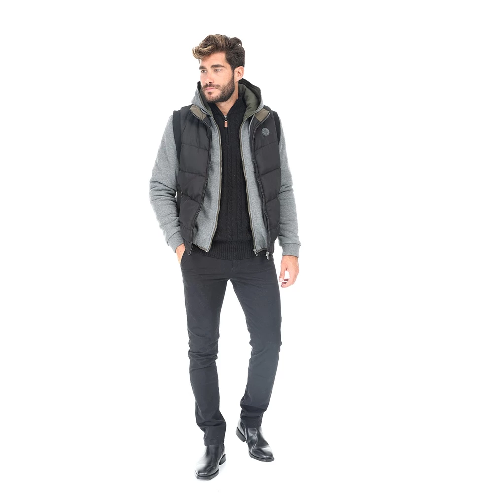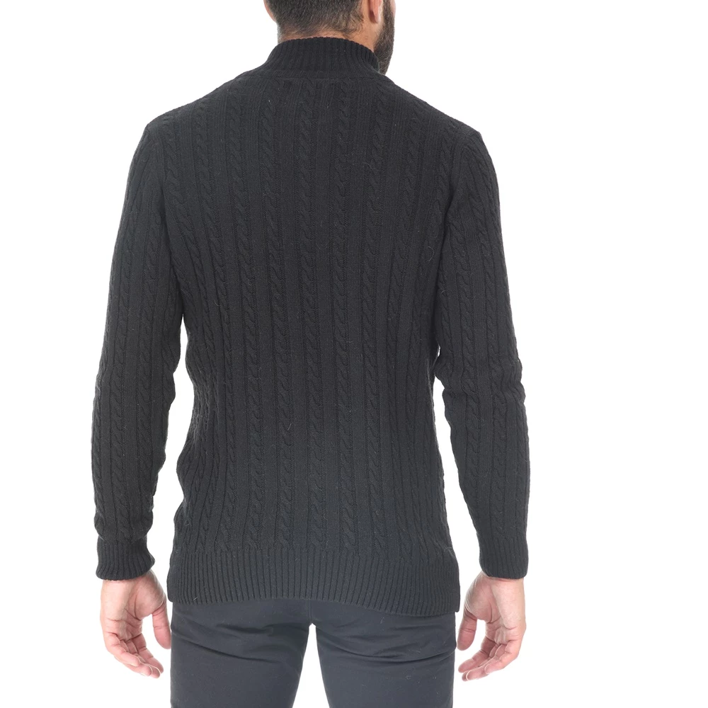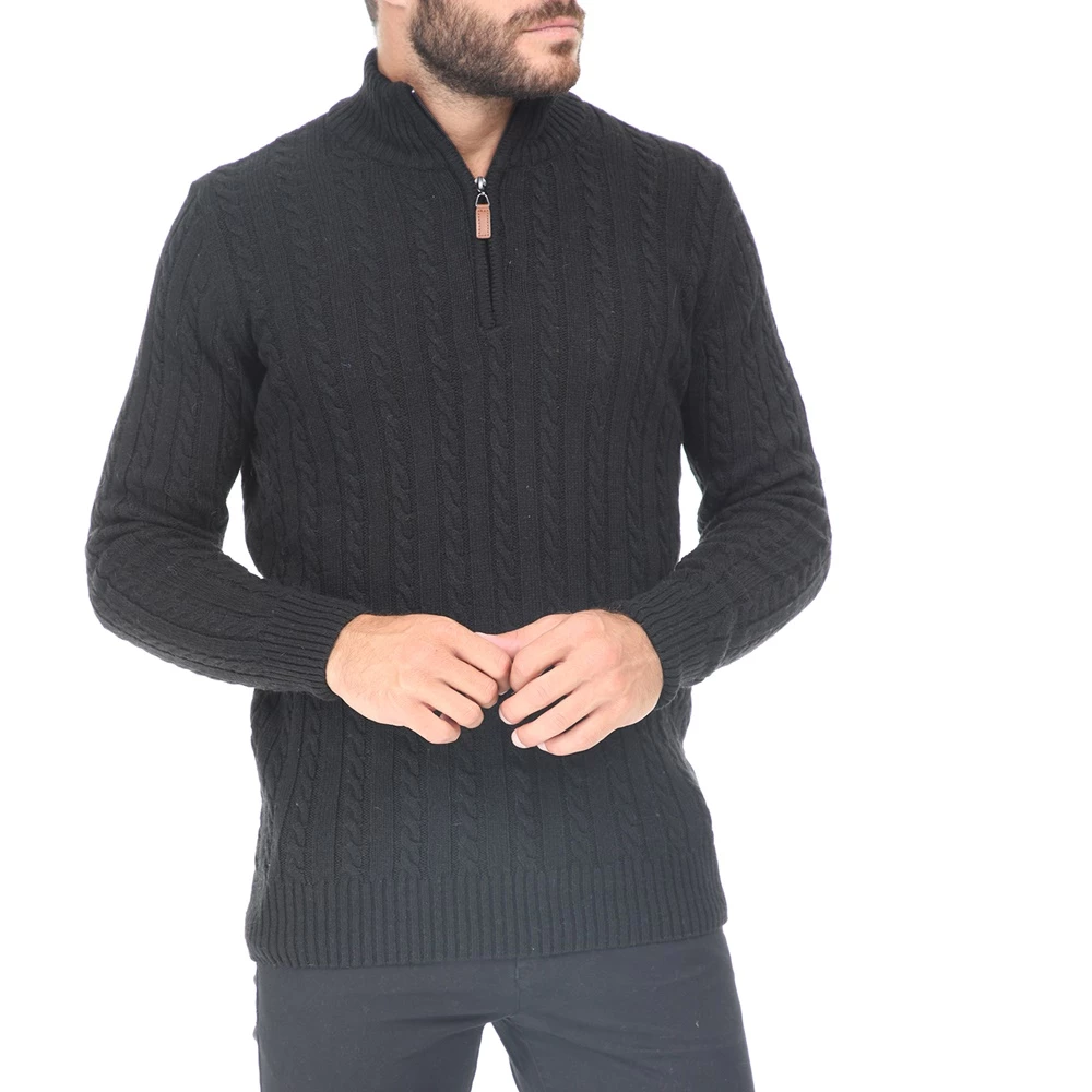 Ανδρικό πλεκτό πουλόβερ σε μπλε απόχρωση με ψηλό γιακά και φερμουάρ. Έχει κανονική γραμμή και μοντέρνο στιλ. Ζεστή και άνετη για casual εμφανίσεις.