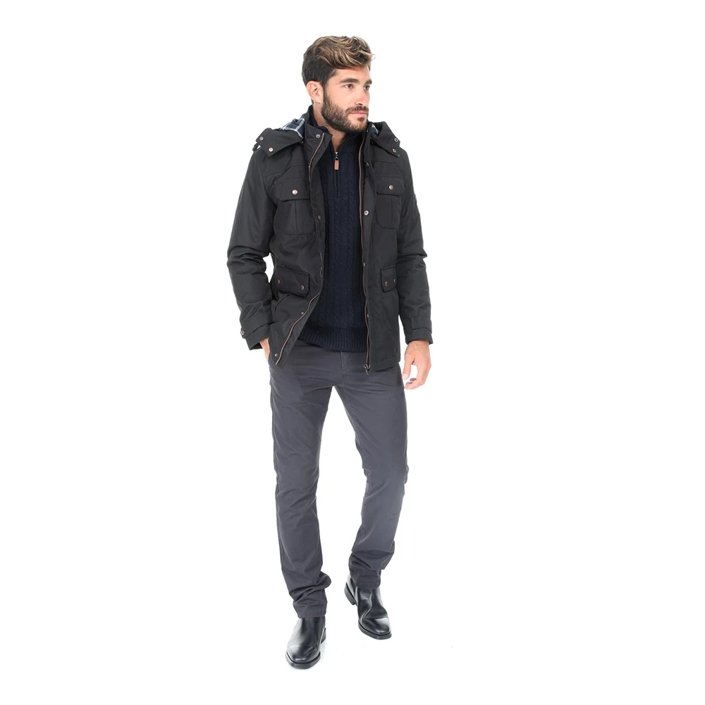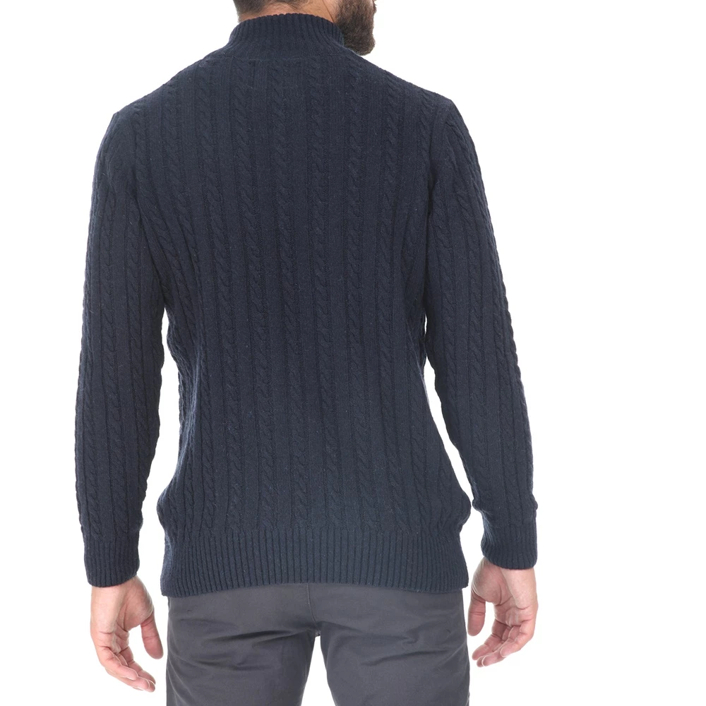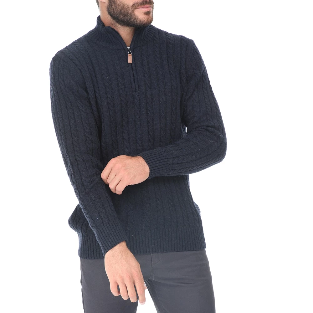 Ανδρικό πλεκτό πουλόβερ σε μπλε απόχρωση με ψηλό γιακά και φερμουάρ. Έχει κανονική γραμμή και μοντέρνο στιλ. Ζεστή και άνετη για casual εμφανίσεις.