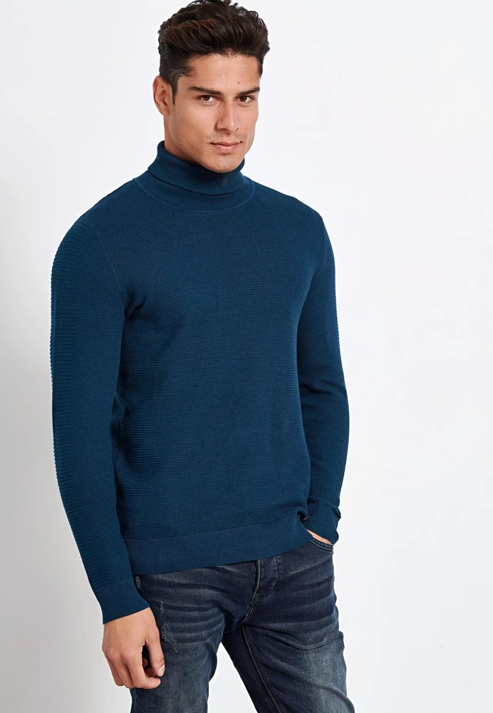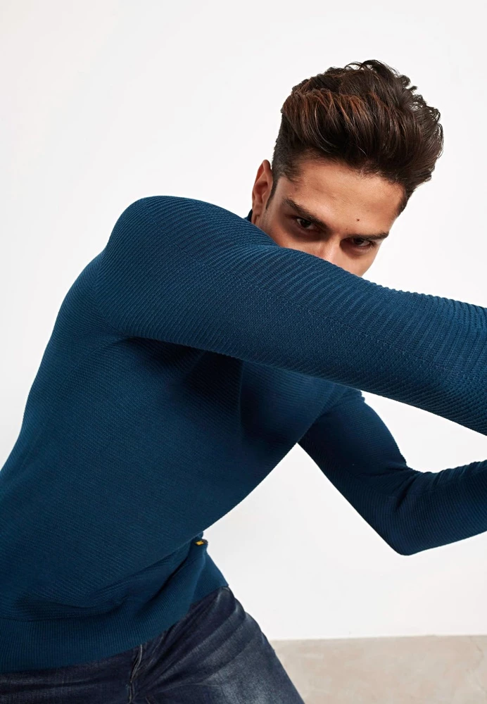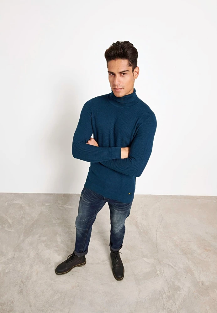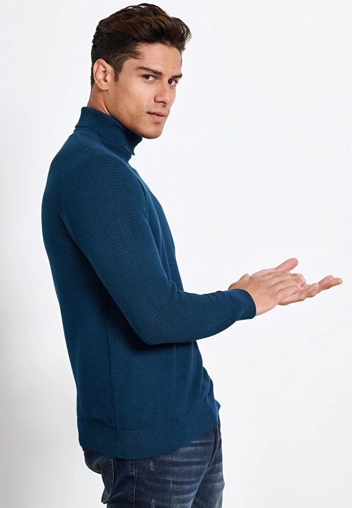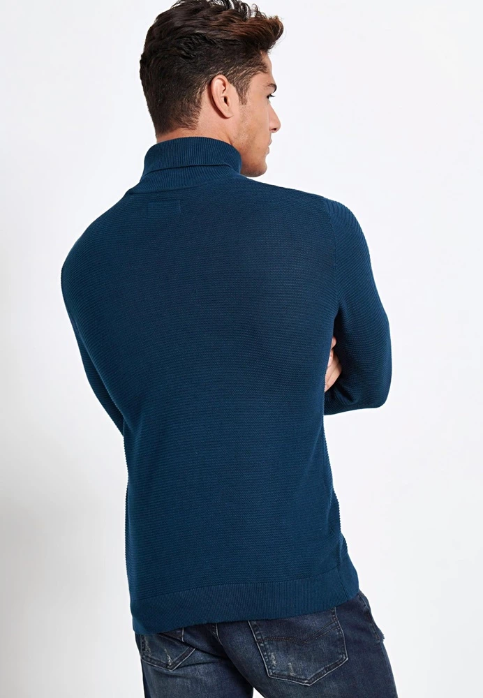 Ανδρικό πλεκτό ζιβάγκο FUNKY BUDDHA σε μπλε απόχρωση. Σε ίσια γραμμή, από βαμβακερή πλέξη. Έχει μακριά μανίκια και όρθια γυριστή λαιμόκοψη. Λάστιχο ριμπ στις μανσέτες και στην βάση.