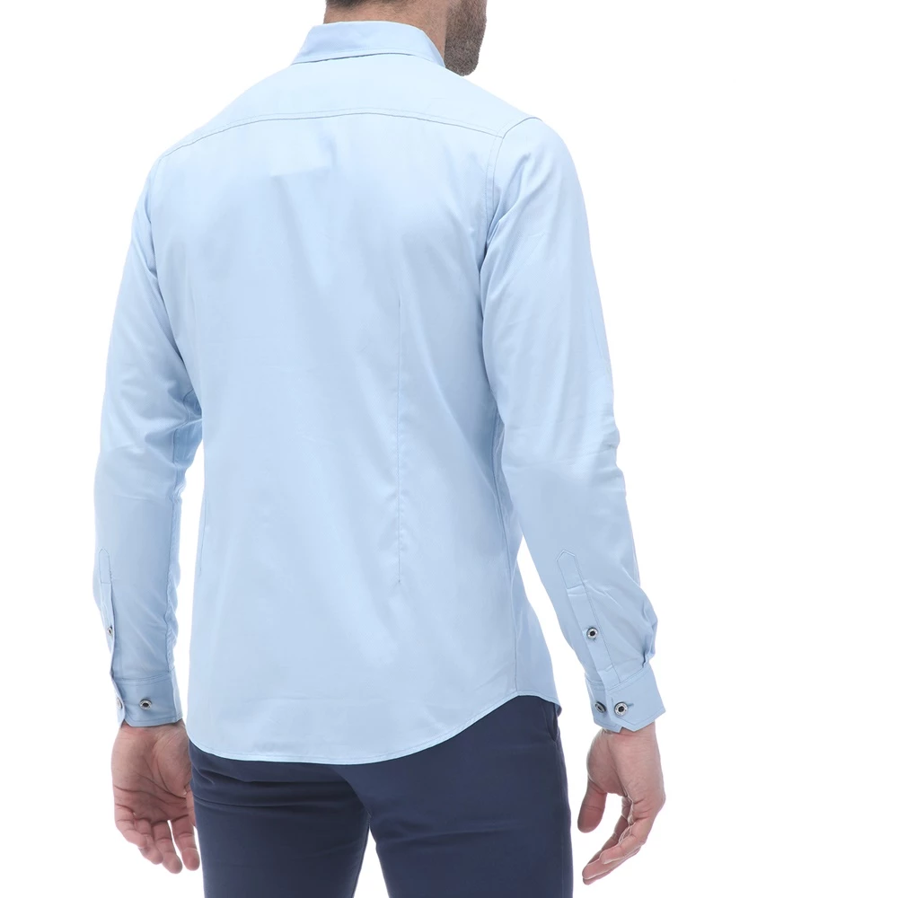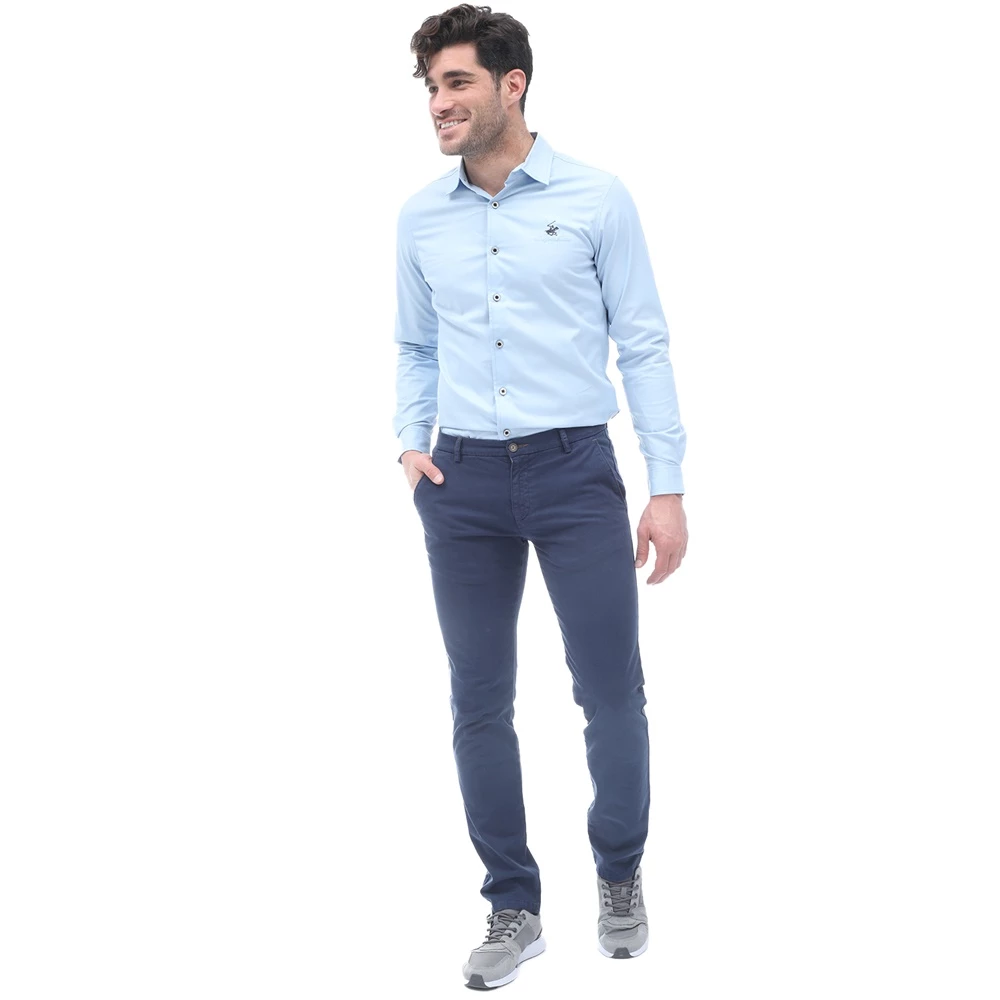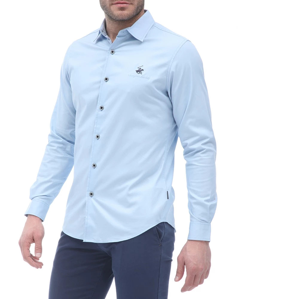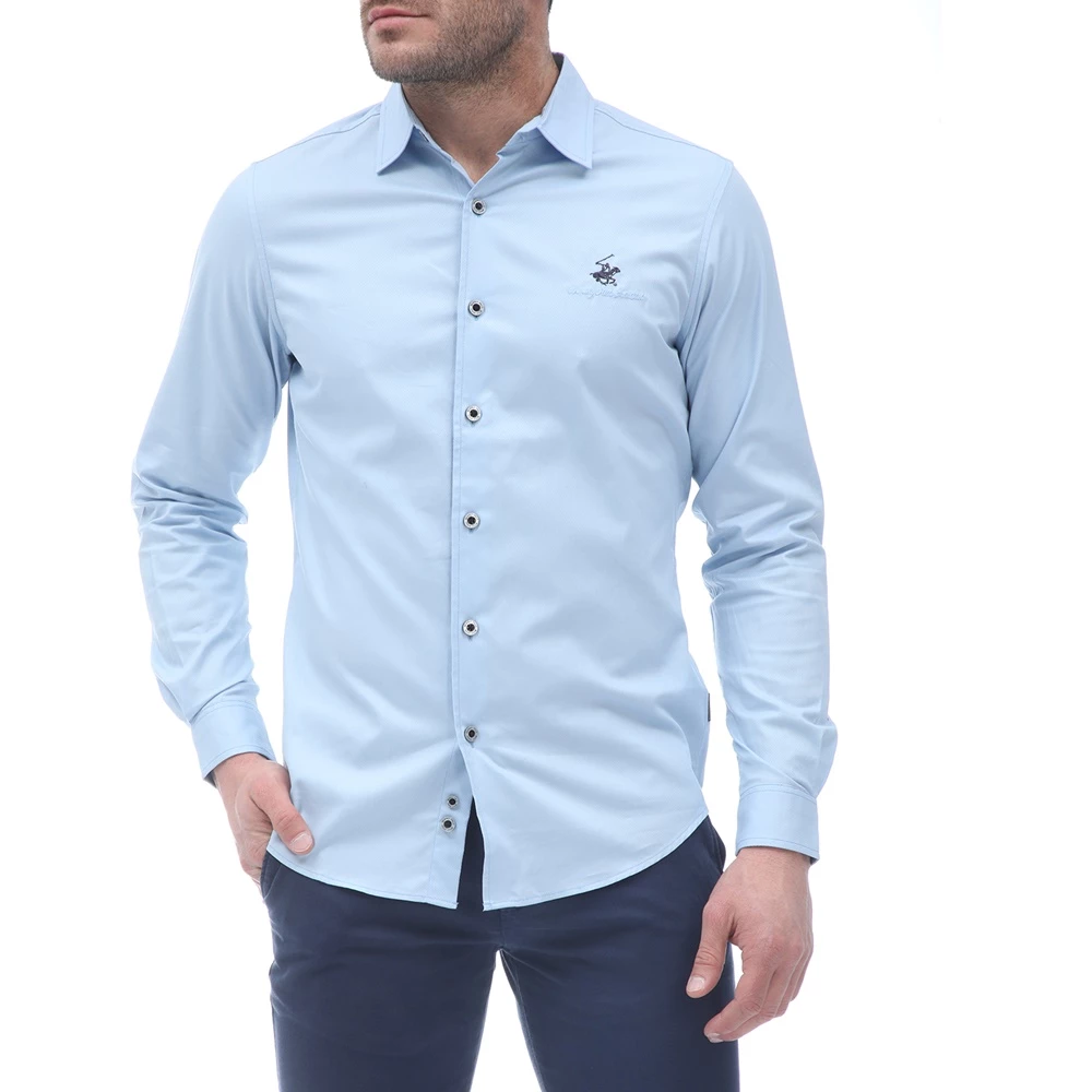 Ανδρικό πουκάμισο BEVERLY HILLS POLO CLUB σε μπλε απόχρωση. Σε κανονική γραμμή, από βαμβακερή σύνθεση. Έχει μακριά μανίκια και κλασικό γιακά με ελεύθερες άκρες. Κλείνει με κουμπιά μπροστά.