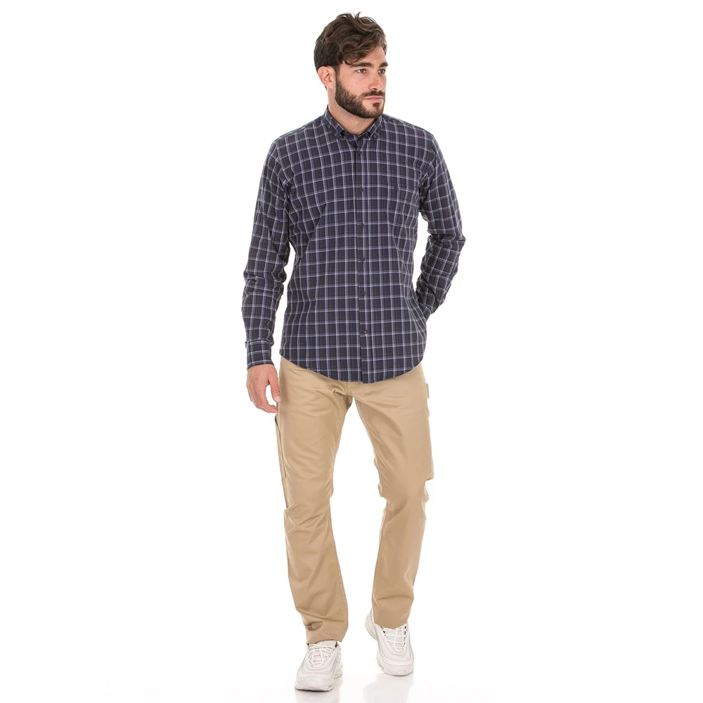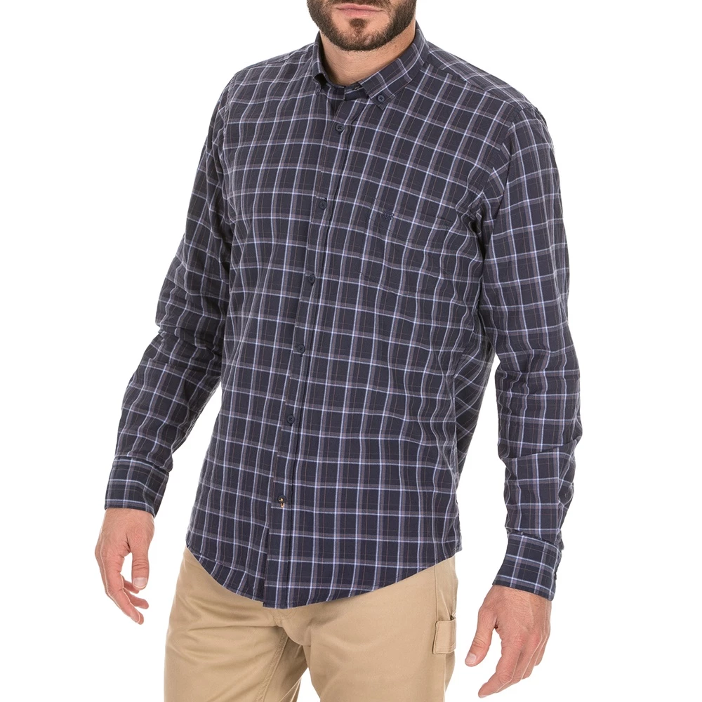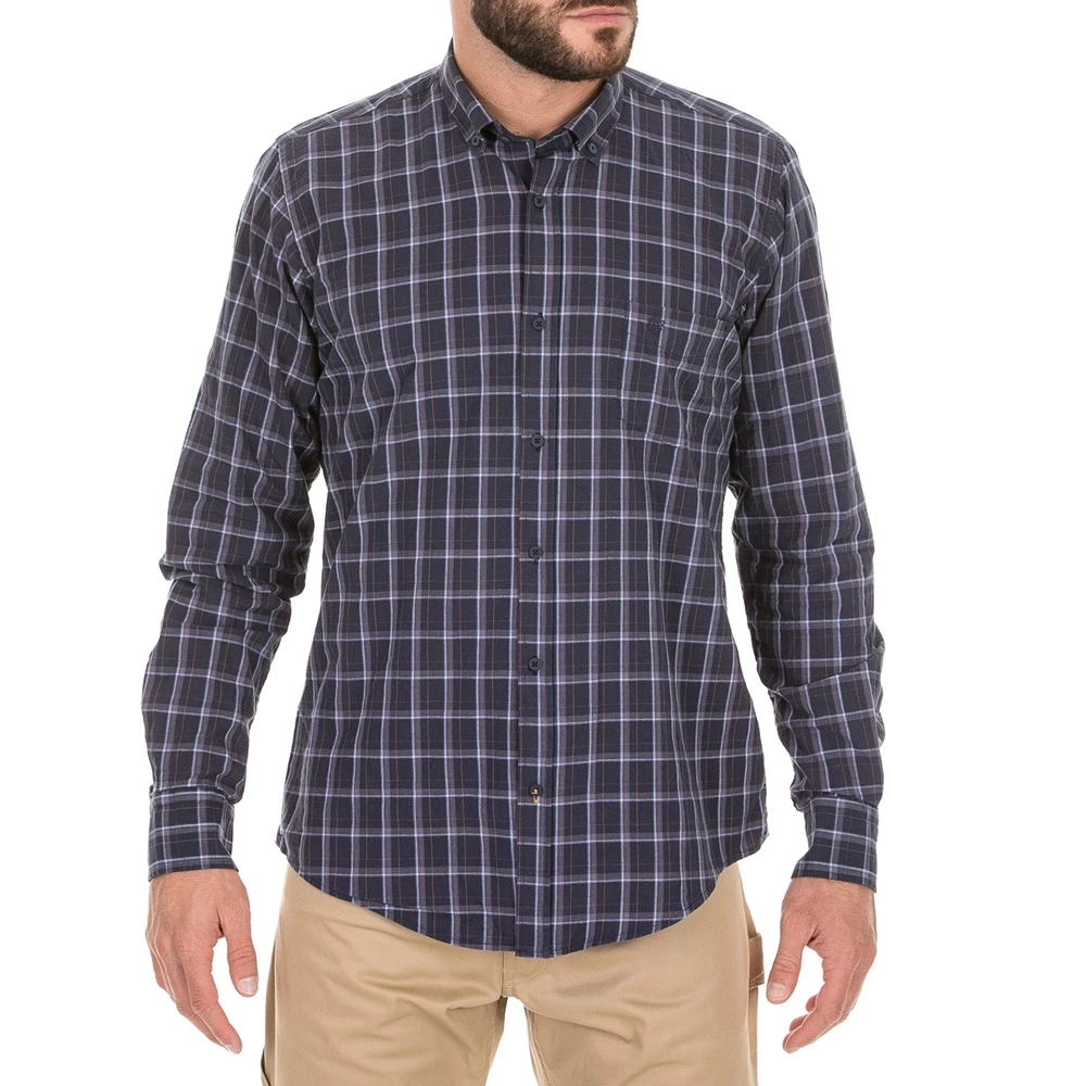 Ανδρικό πουκάμισο DORS σε μπλε απόχρωση με γκρι καρό μοτίβο. Είναι σε ίσια γραμμή, από βαμβακερή σύνθεση. Με μακριά μανίκια και γιακά με κουμπάκια στις άκρες. Διαθέτει μία τσέπη στο στήθος και κέντημα με το λογότυπο. Στρογγυλεμένη βάση για να φοριέται και έξω από το παντελόνι. Κλείνει με κουμπιά μπροστά.