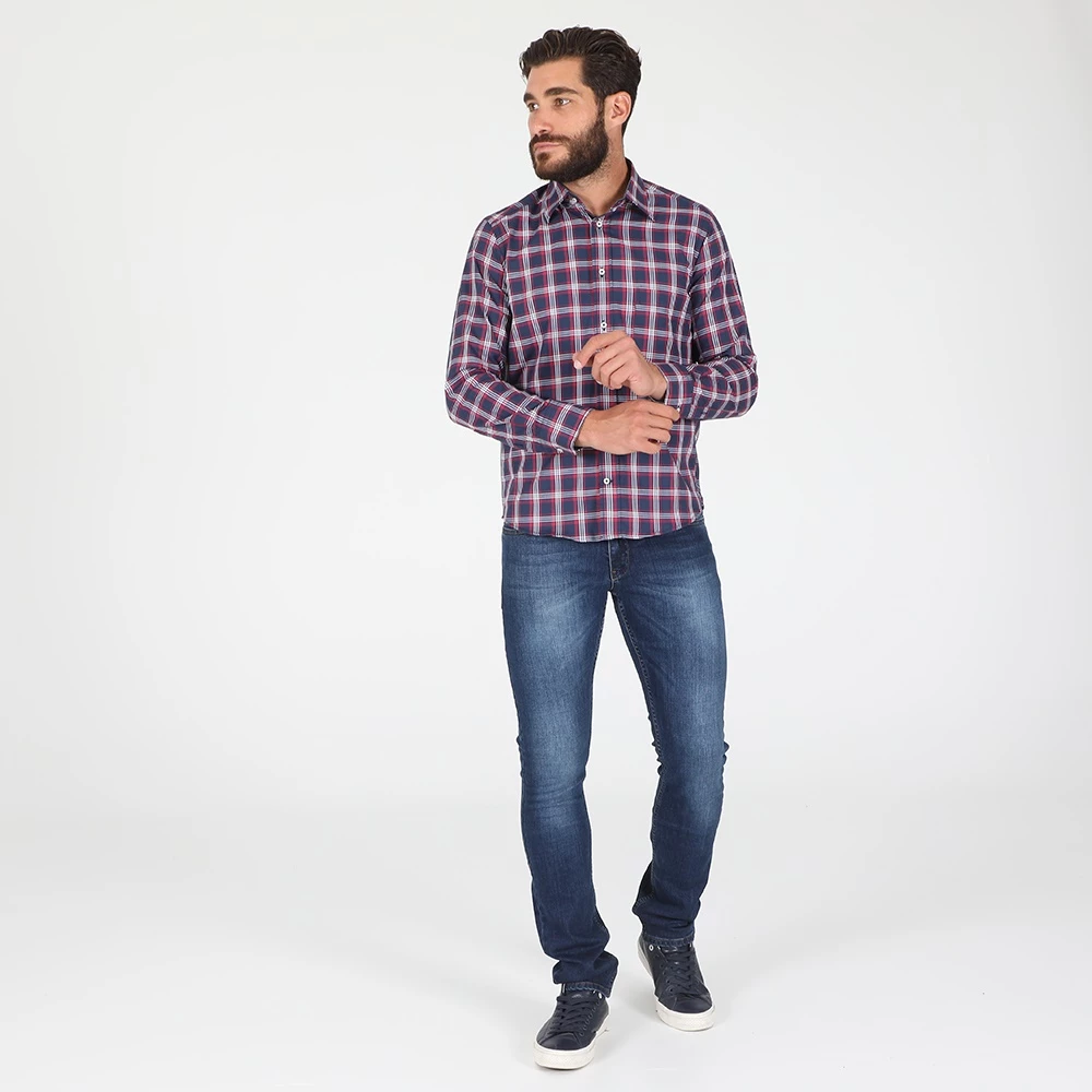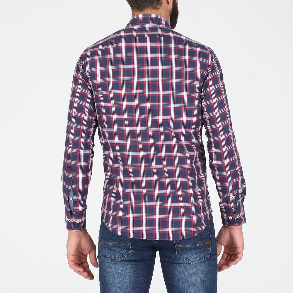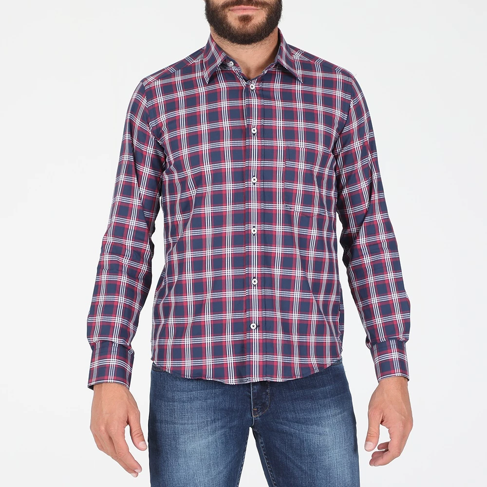 Ανδρικό πουκάμισο DORS σε μπλε απόχρωση, με καρό κόκκινο και λευκό μοτίβο. Σε ίσια γραμμή, από βαμβακερή σύνθεση. Έχει μακριά μανίκια και γιακά με ελεύθερες άκρες. Κλείνει με κουμπιά μπροστά.