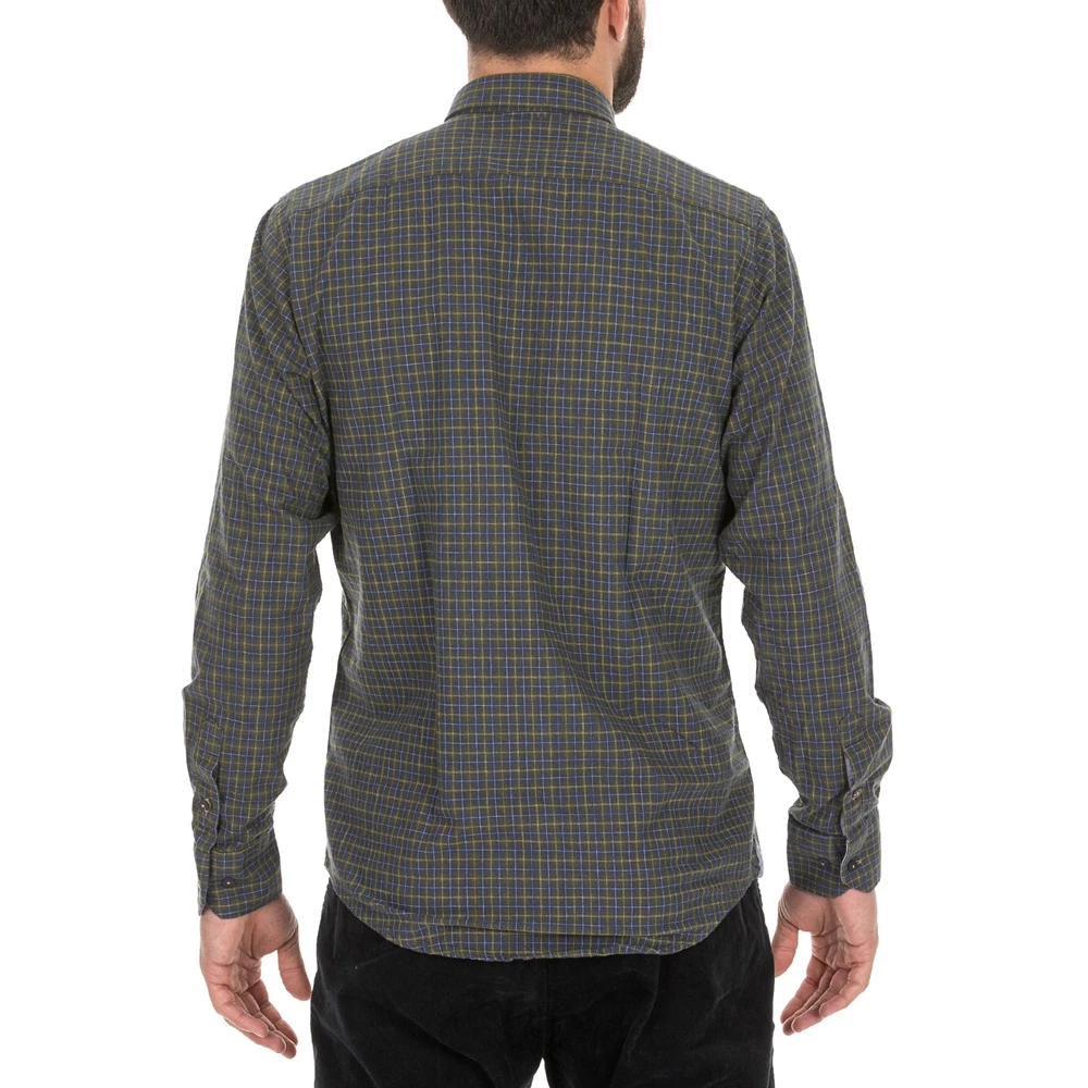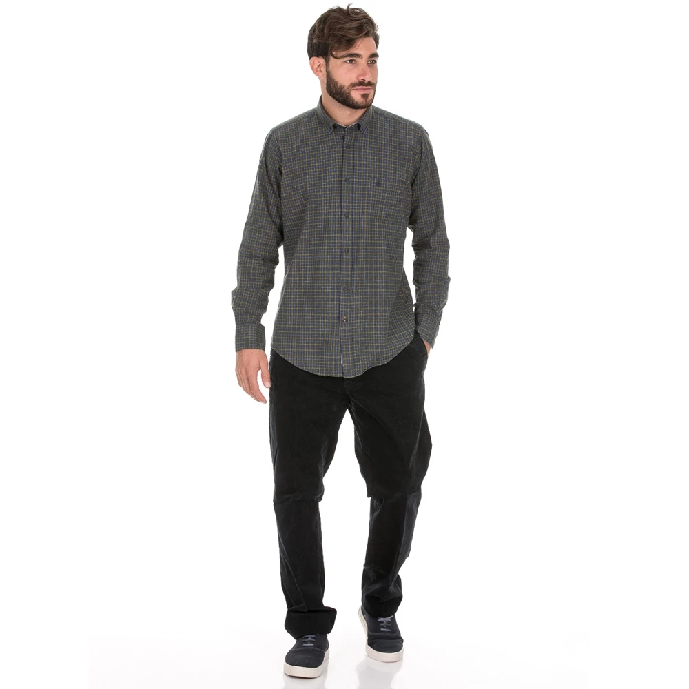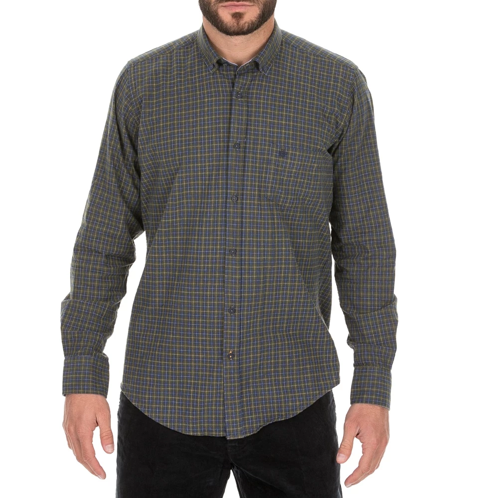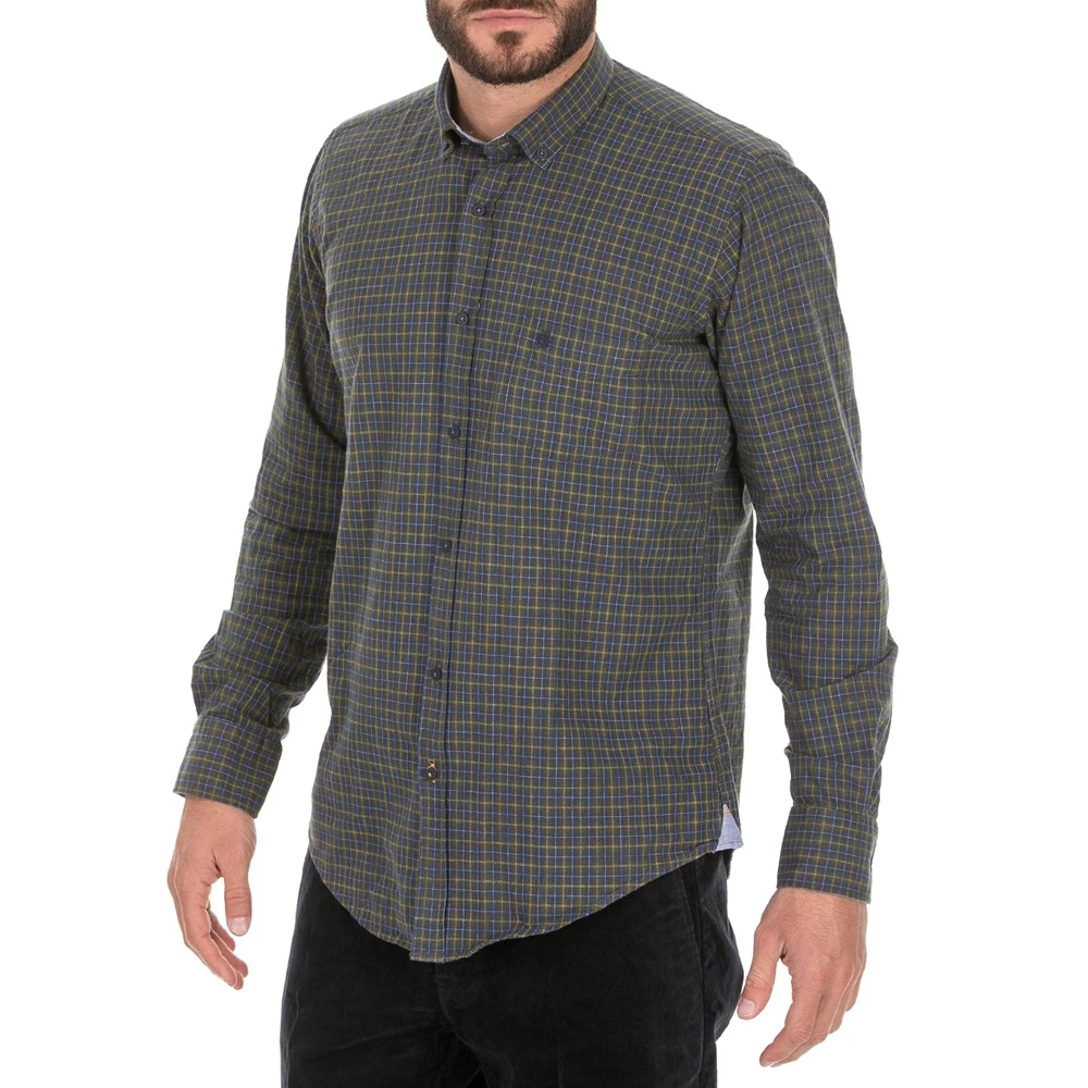 Ανδρικό πουκάμισο DORS σε σκούρη μπλε και πράσινη απόχρωση με καρό μοτίβο. Είναι σε ίσια γραμμή, από βαμβακερή σύνθεση. Με μακριά μανίκια και γιακά με κουμπάκια στις άκρες. Διαθέτει μία τσέπη στο στήθος και κέντημα με το λογότυπο. Στρογγυλεμένη βάση για να φοριέται και έξω από το παντελόνι. Κλείνει με κουμπιά μπροστά.