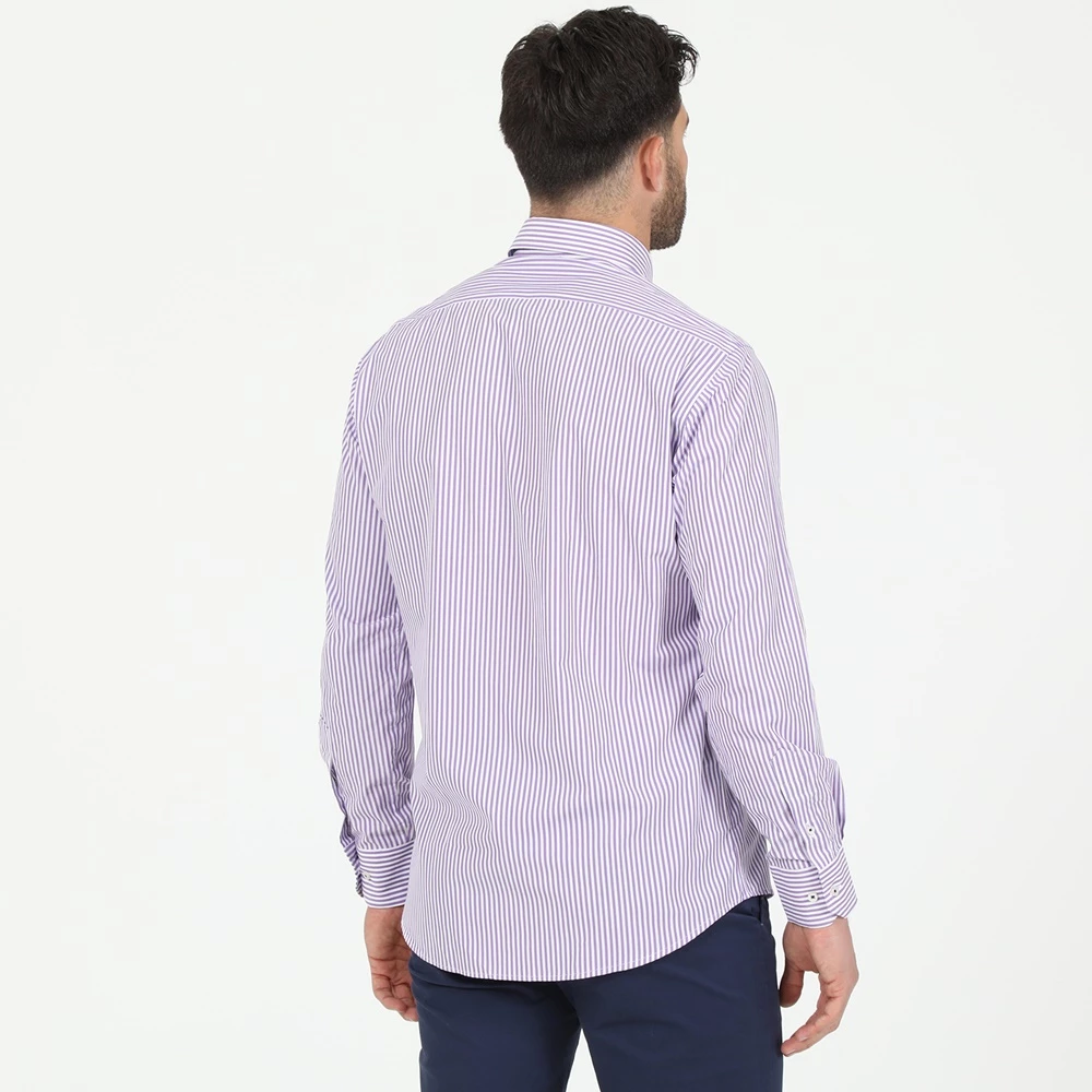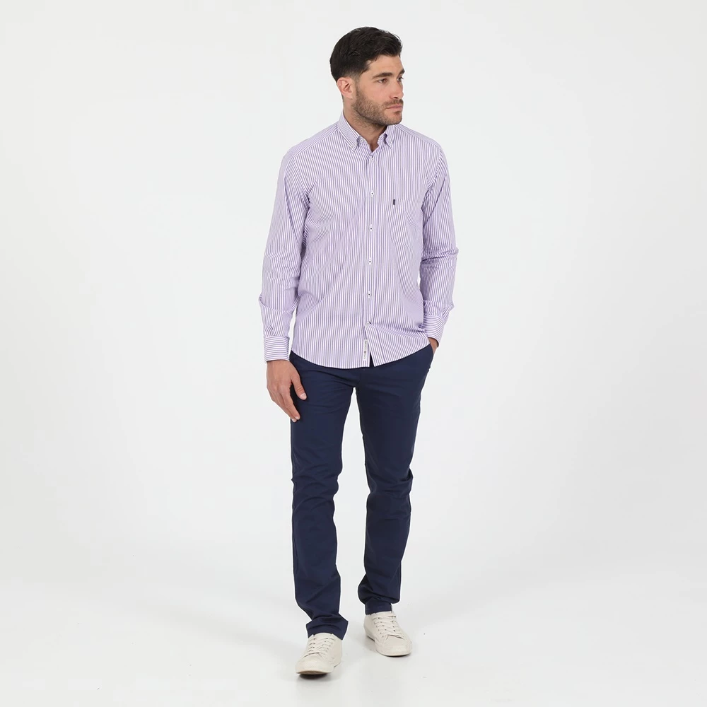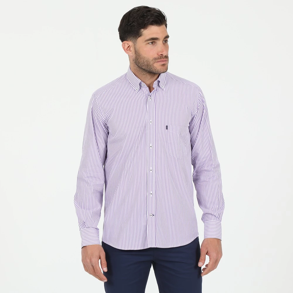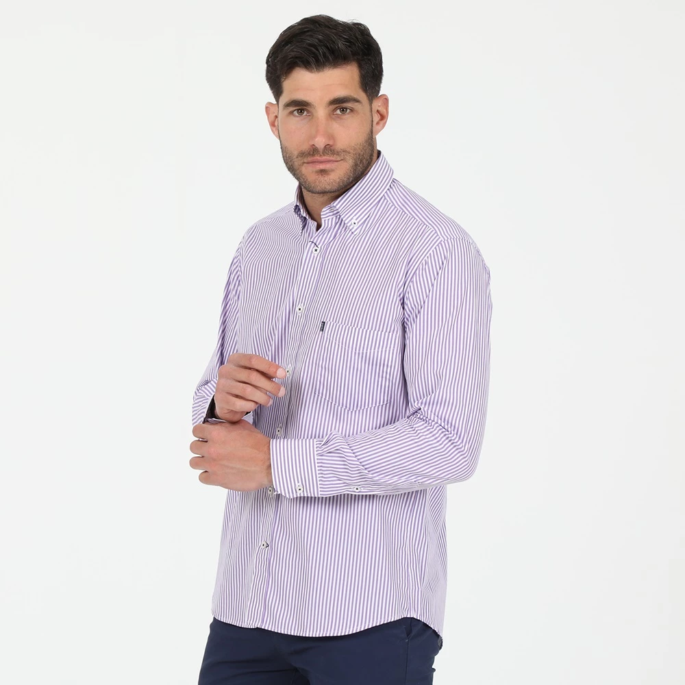 Ανδρικό πουκάμισο DORS με λευκό μοβ ριγέ μοτίβο. Από βαμβακερό αναπνέον ύφασμα που σιδερώνεται εύκολα, σε κανονική γραμμή. Έχει μακριά μανίκια και κλασικό γιακά με ρέλι στο εσωτερικό, μυτερές άκρες και κουμπιά. Τσέπη μπροστά με μικρή διακοσμητική ετικέτα με το λογότυπο. Κλείνει με κουμπιά.