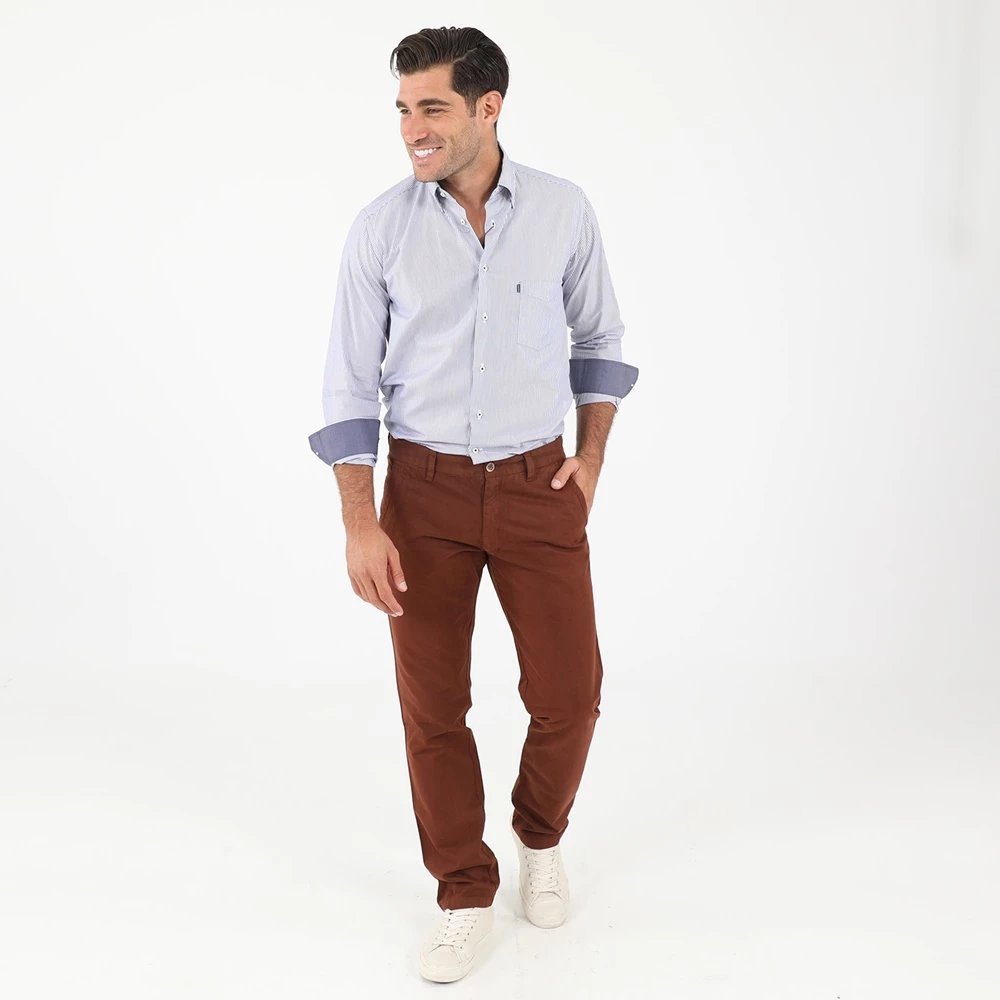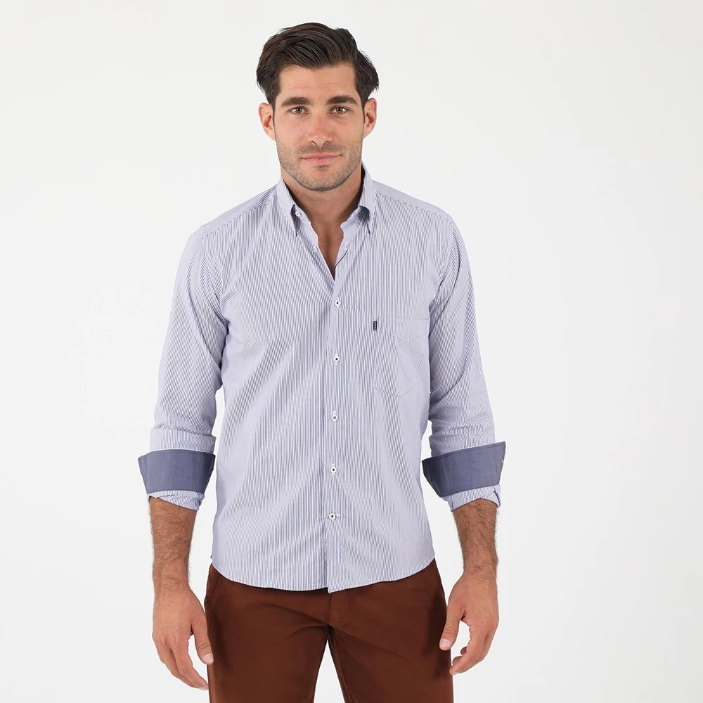 Ανδρικό πουκάμισο DORS με ριγέ λευκό και μπλε μοτίβο και μία τσέπη στο στήθος. Σε ίσια γραμμή, από βαμβακερή σύνθεση. Έχει μακριά μανίκια, κλασικό γιακά με ελεύθερες άκρες και κλείνει με κουμπάκια μπροστά.
