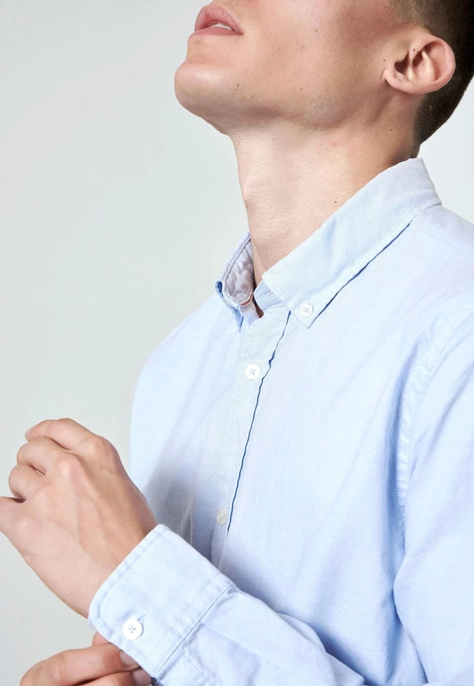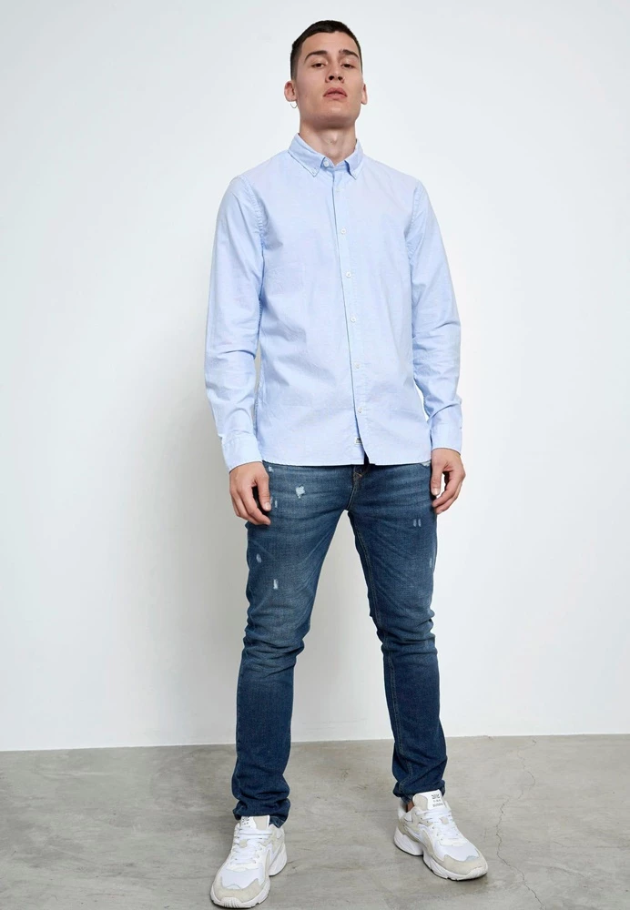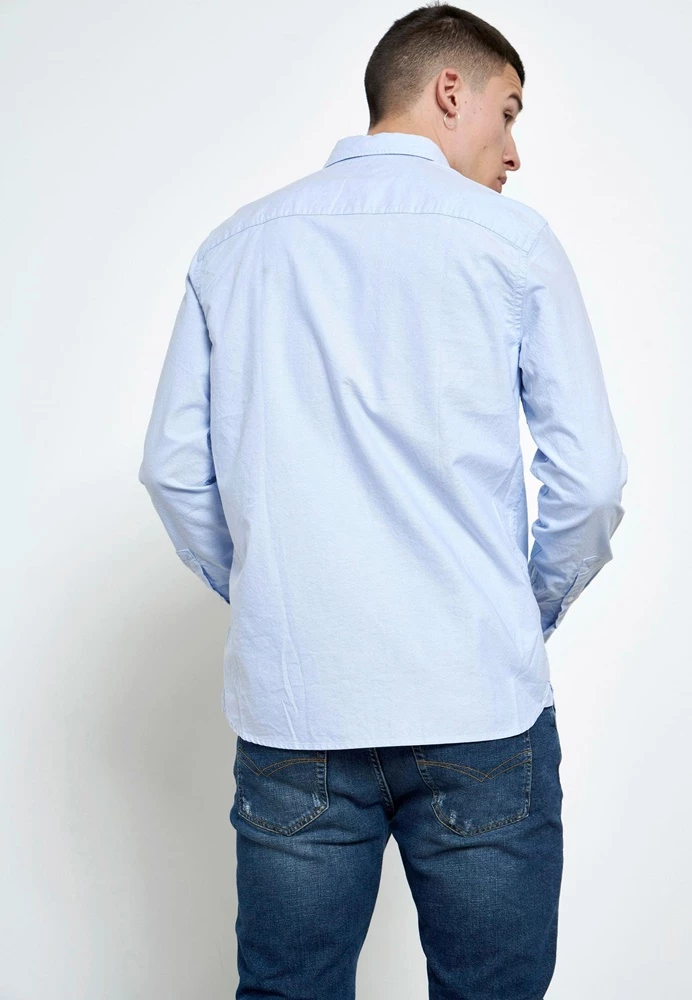 Ανδρικό πουκάμισο FUNKY BUDDHA σε γαλάζια απόχρωση. Από ελαστική βαμβακερή ποπλίνα, με κανονική εφαρμογή. Έχει μακριά μανίκια και κλασικό γιακά με κουμπάκια στις άκρες. Κλείνει με κουμπιά μπροστά.