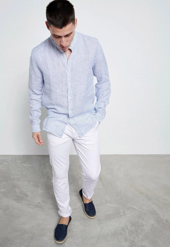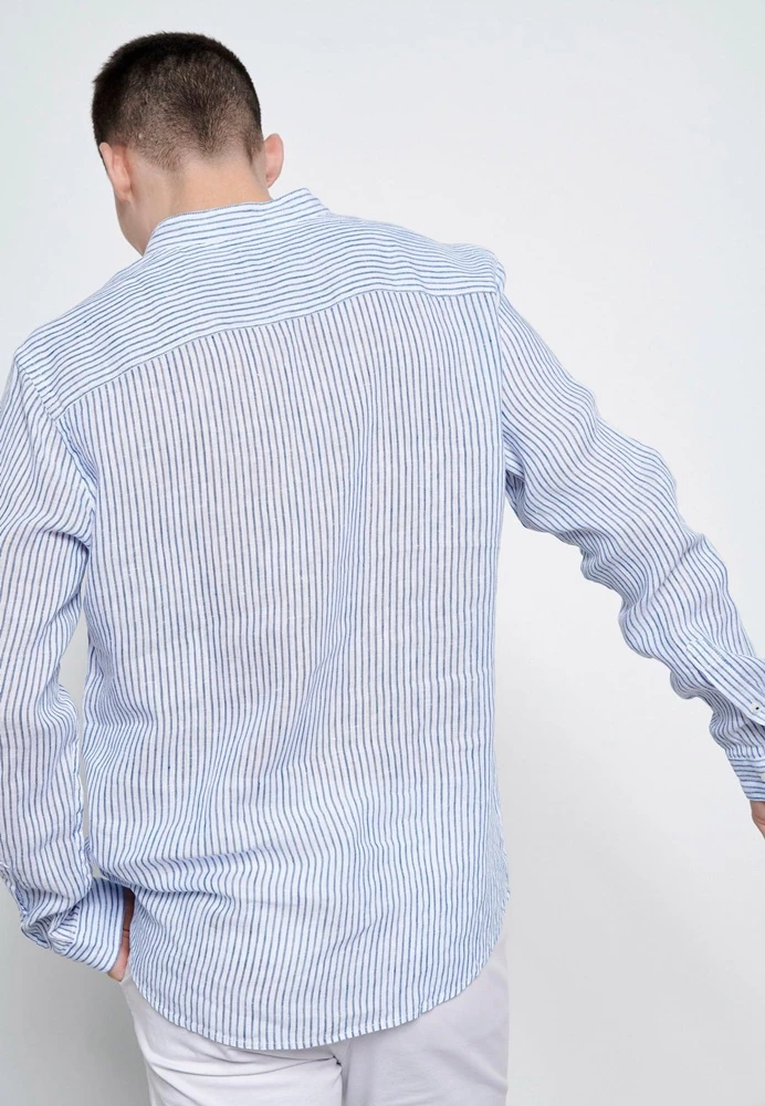 Ανδρικό πουκάμισο FUNKY BUDDHA σε λευκό, μπλε χρώμα, με ρίγες. Με κανονική εφαρμογή, από βαμβακερή σύνθεση. Έχει μακριά μανίκια και mao γιακά. Κλείνει με κουμπιά μπροστά.