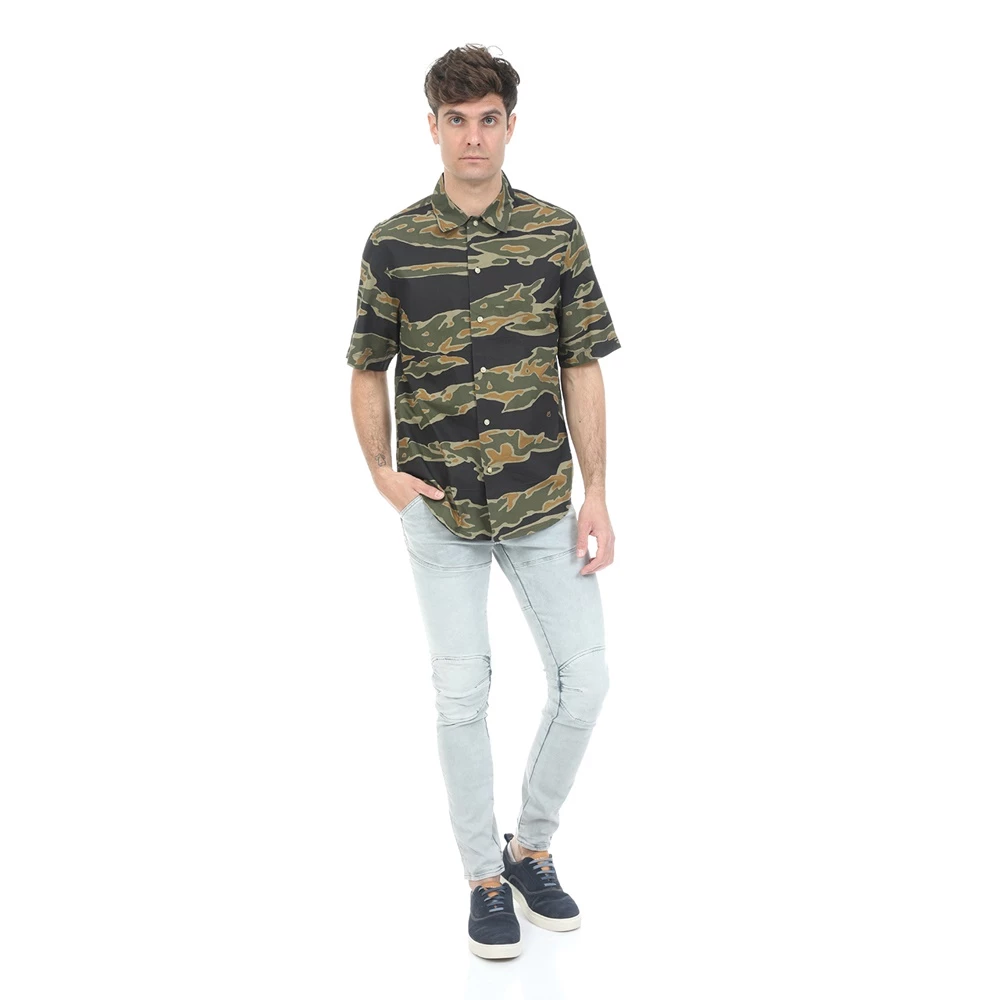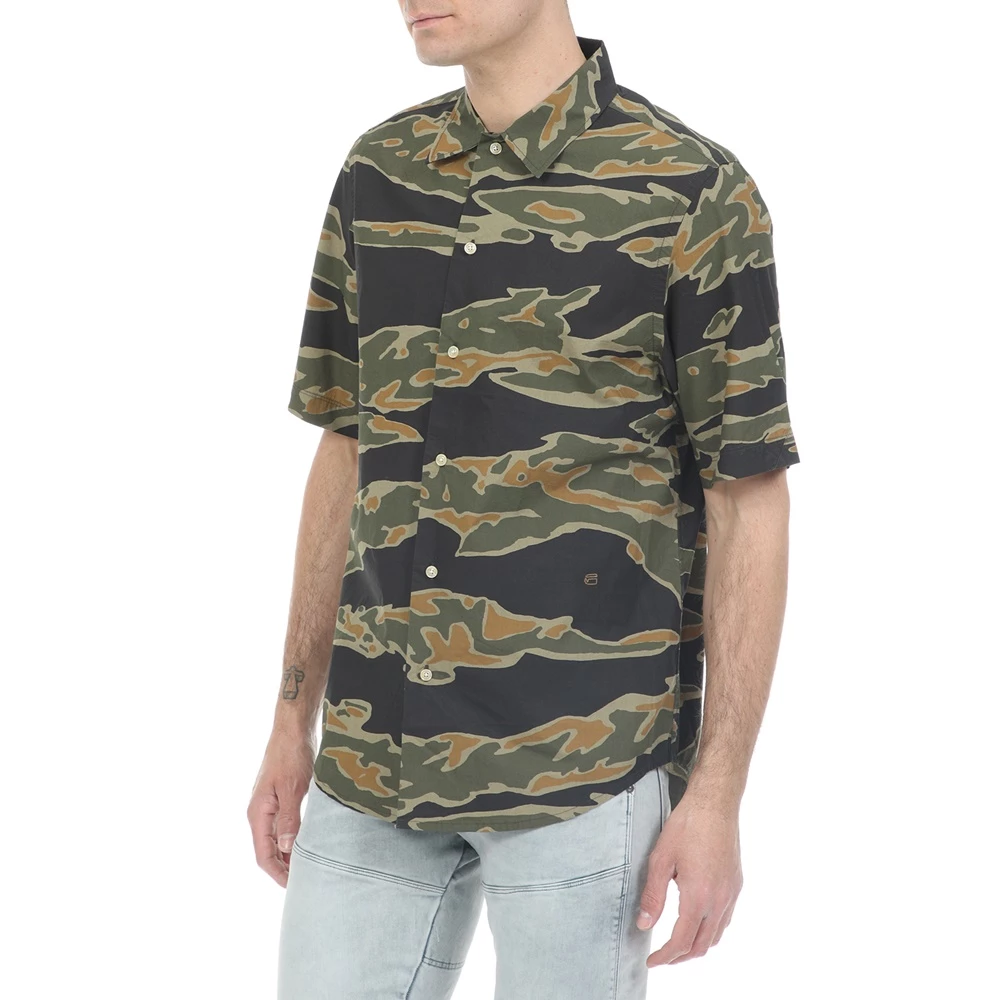 Ανδρικό πουκάμισο G-STAR RAW σε μαύρο χρώμα, με χακί και πορτοκαλί μοτίβο παραλλαγής. Σε ίσια γραμμή, από βαμβακερή σύνθεση. Έχει κοντά μανίκια και κλασικό γιακά με μυτερές άκρες. Κλείνει με κουμπιά μπροστά.