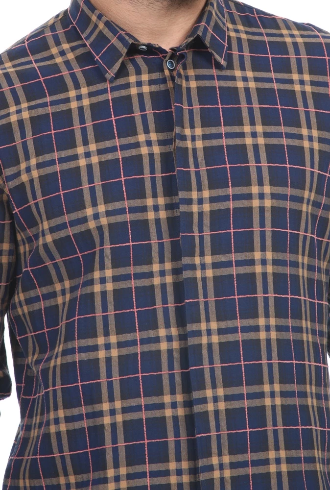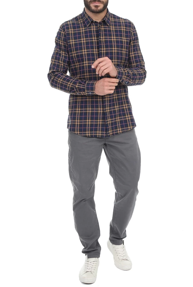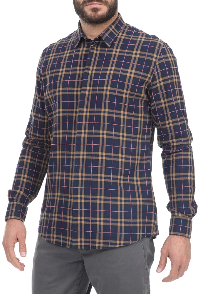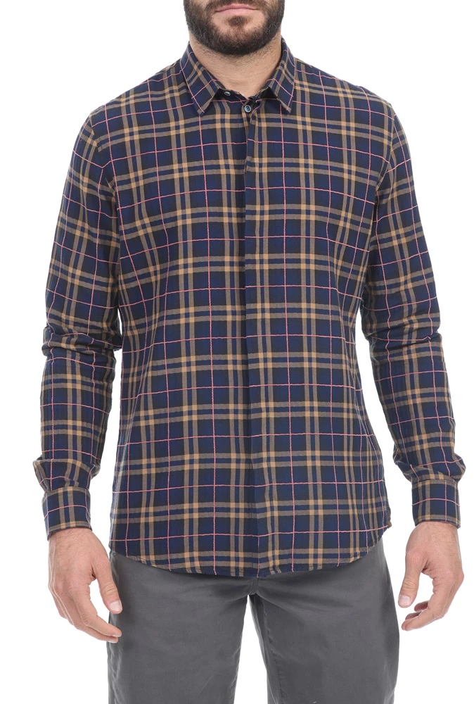 Ανδρικό πουκάμισο GAUDI σε μπλε και καφέ απόχρωση, με καρό μοτίβο. Σε ίσια γραμμή, από βαμβακερή μαλακή σύνθεση. Έχει μακριά μανίκια και κλασικό γιακά με ελεύθερες άκρες. Κλείνει με κουμπιά μπροστά.