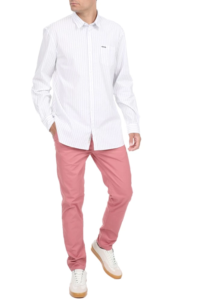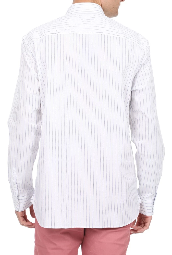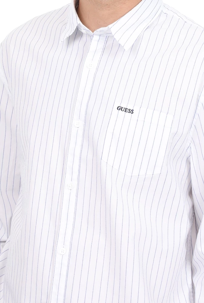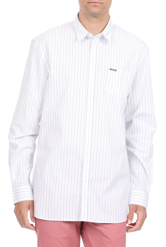 Ανδρικό πουκάμισο GUESS σε λευκό χρώμα με ριγέ μπλε μοτίβο. Σε ίσια γραμμή, από βαμβακερή σύνθεση. Με μακριά μανίκια και κλασικό γιακά με μυτερές άκρες. Διαθέτει μία τσέπη στο στήθος με κεντημένο λογότυπο και κλείνει με κουμπιά μπροστά.
