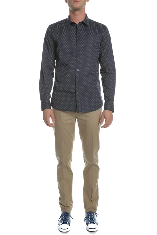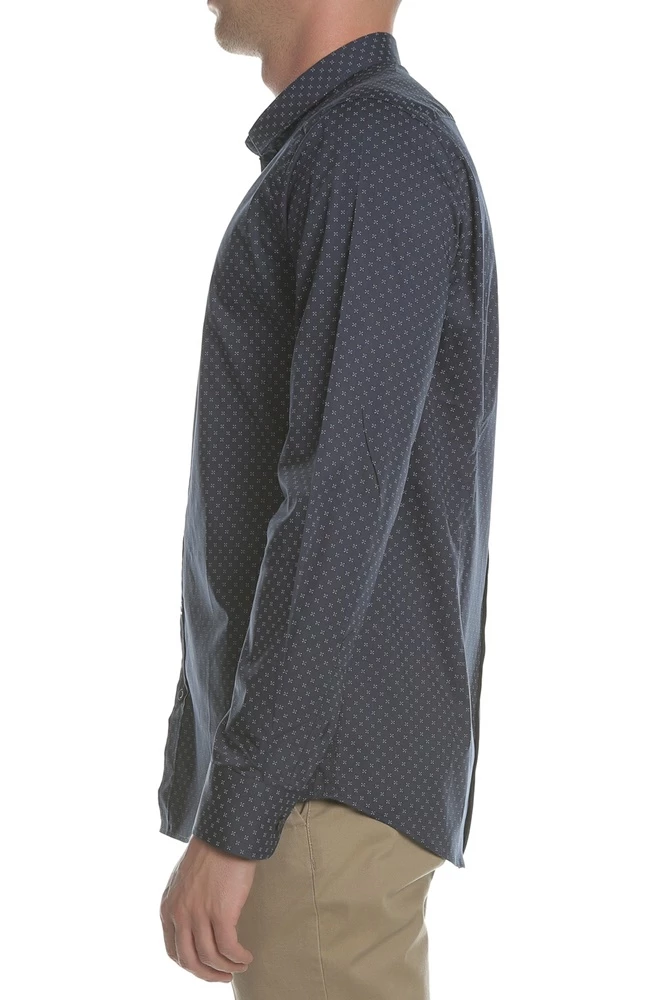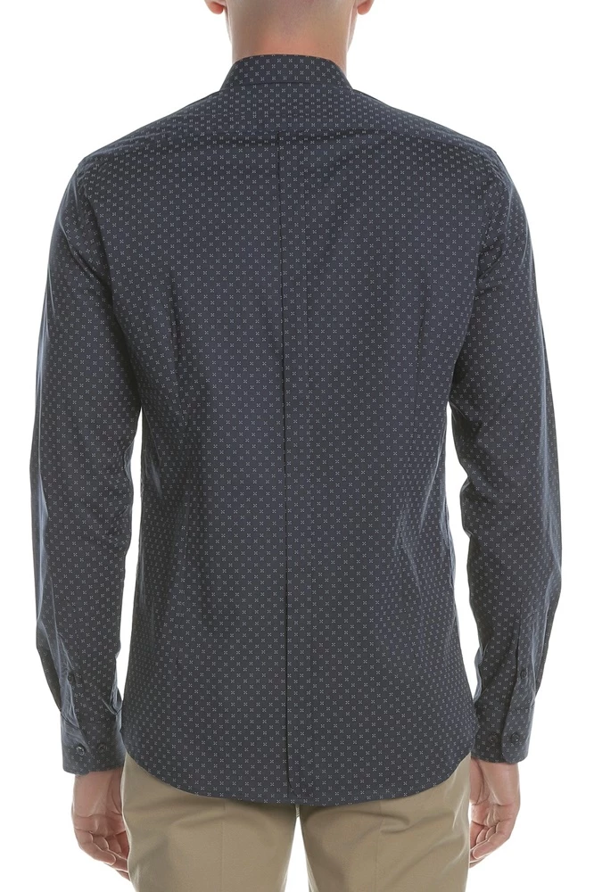 Ανδρικό μακρυμάνικο πουκάμισο σε μπλε απόχρωση με διακριτικό μοτίβο, κλασική γραμμή, που συνδυάζει στιλ, ποιότητα και άνεση. Αποτελεί ιδανική επιλογή για casual chic εμφανίσεις.