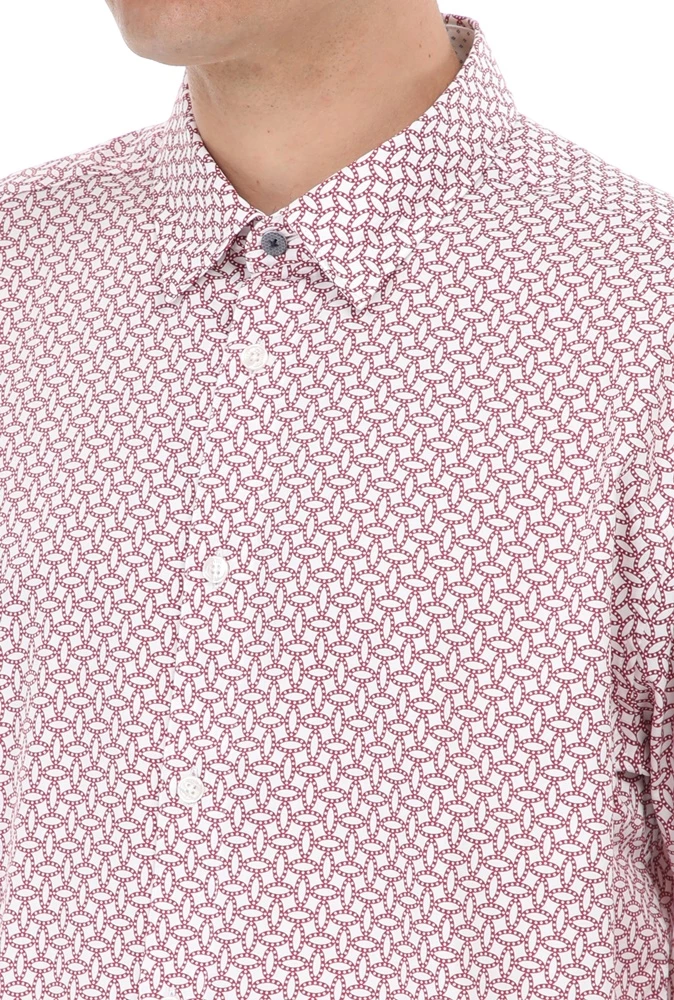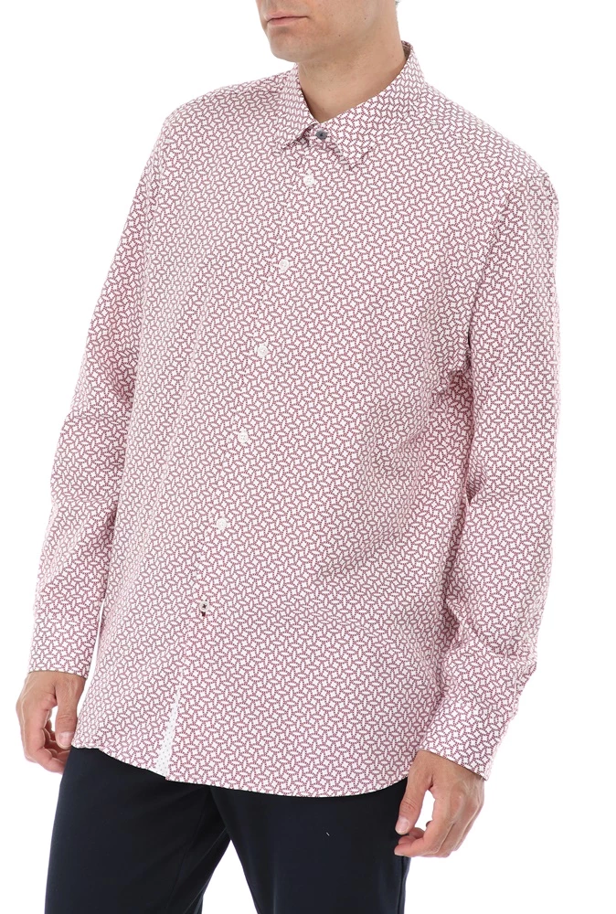 Ανδρικό πουκάμισο TED BAKER σε εκρού απόχρωση, με κόκκινα γεωμετρικά μοτίβα σε όλη την επιφάνεια. Είναι σε ίσια γραμμμή, από βαμβακερή σύνθεση. Με μακριά μανίκια και κλασικό γιακά με ελέυθερες άκρες. Κλείνει με κουμπιά μπροστά.