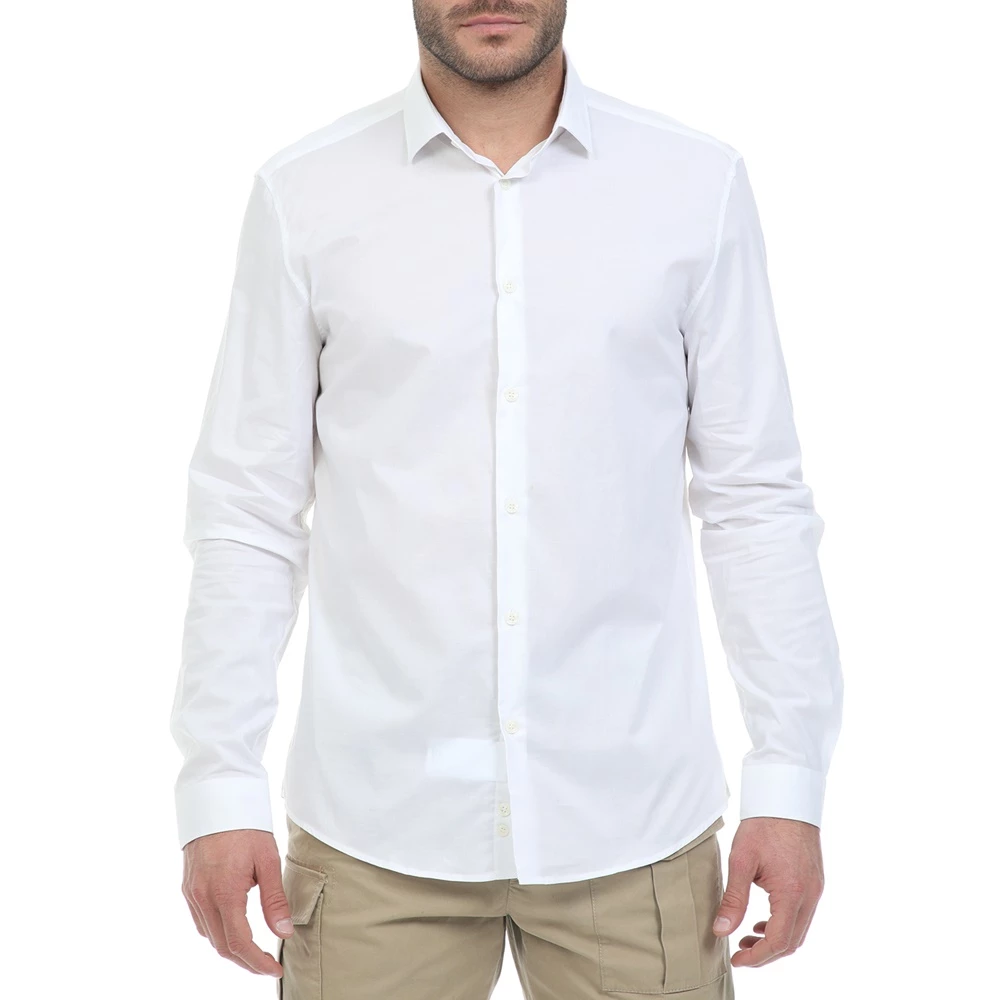 Ανδρικό πουκάμισο VERSACE σε λευκό χρώμα. Από ελαστική βαμβακερή σύνθεση, σε slim γραμμή. Έχει μακριά μανίκια και κλασικό γιακά με ελεύθερες άκρες. Κλείνει με κουμπιά μπροστά.