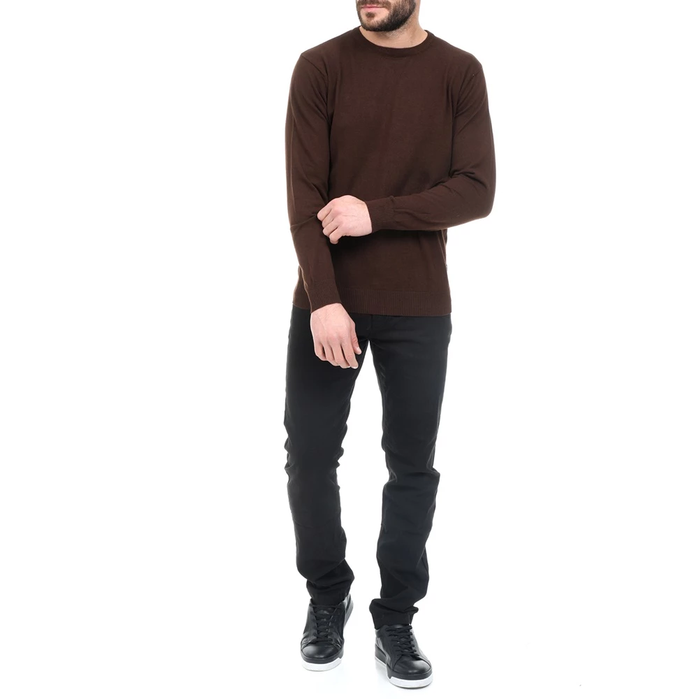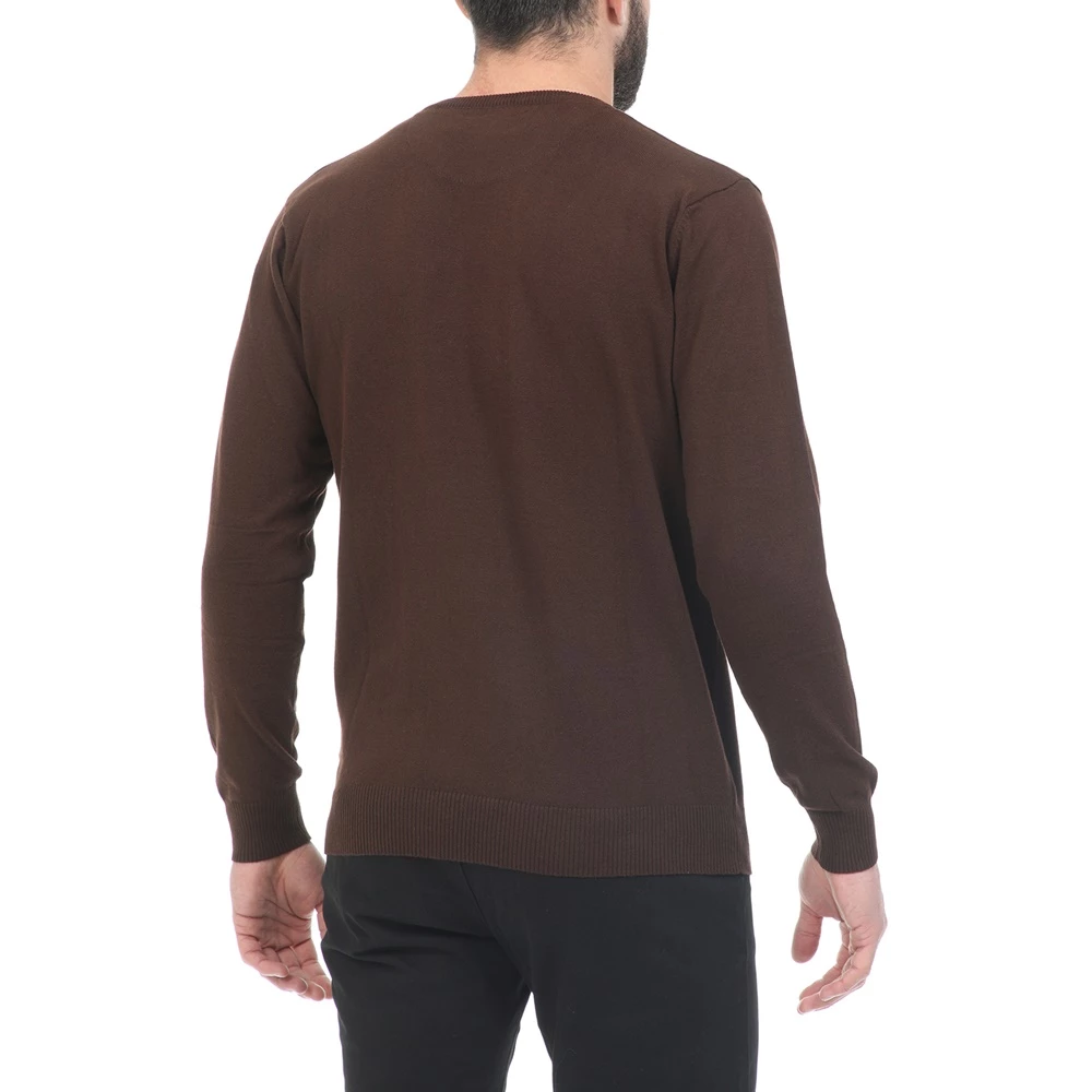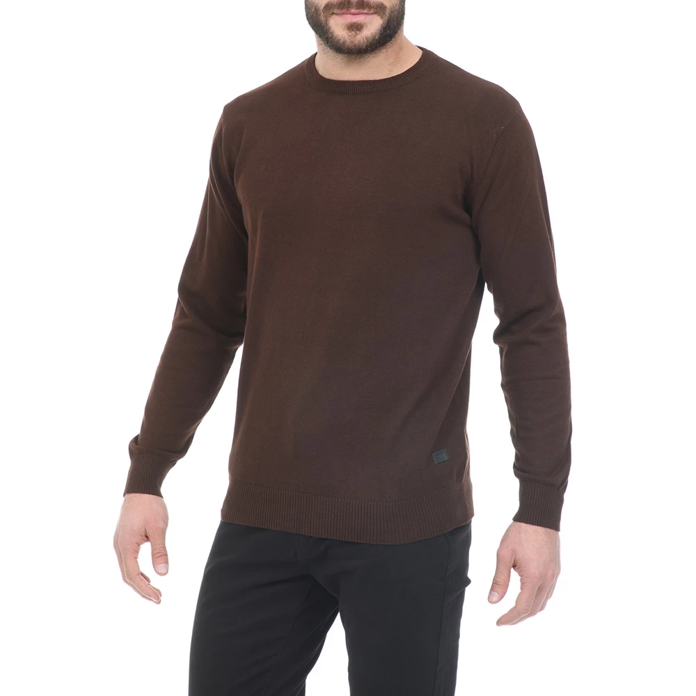 Ανδρικό πουλόβερ RUN σε καφέ απόχρωση. Από βαμβακερή πλέξη, σε ίσια γραμμή. Έχει μακριά μανίκια και στρογγυλή λαιμόκοψη. Λάστιχο ριμπ στις μανσέτες και την βάση.
