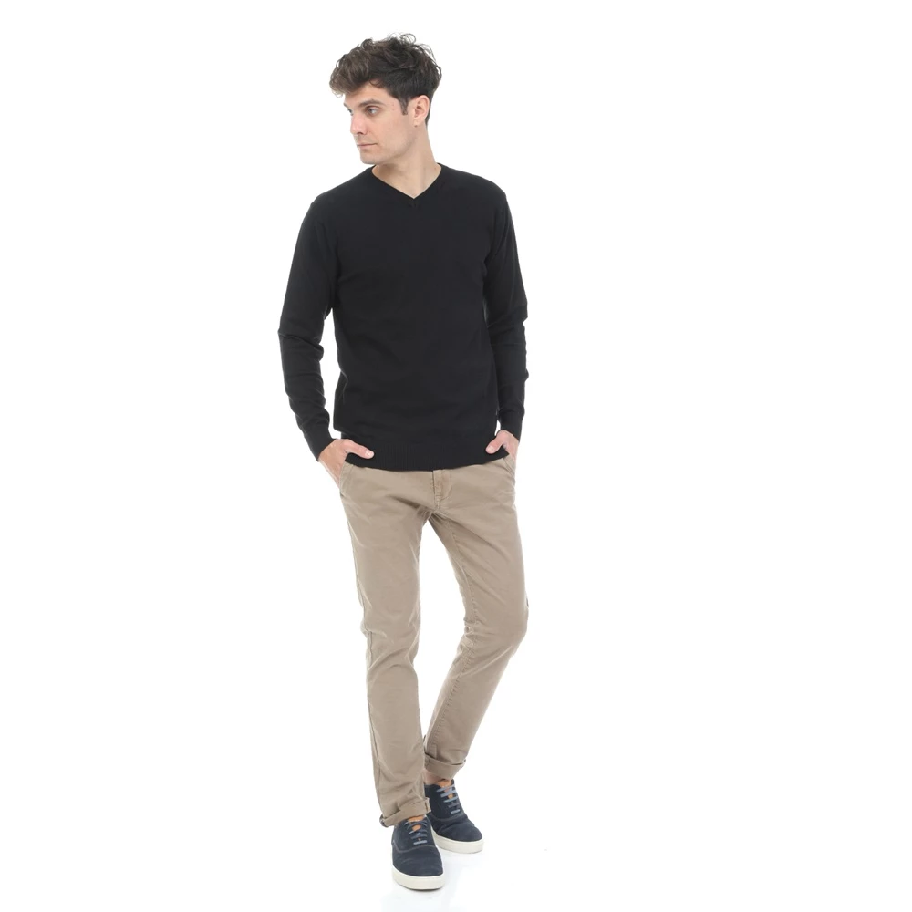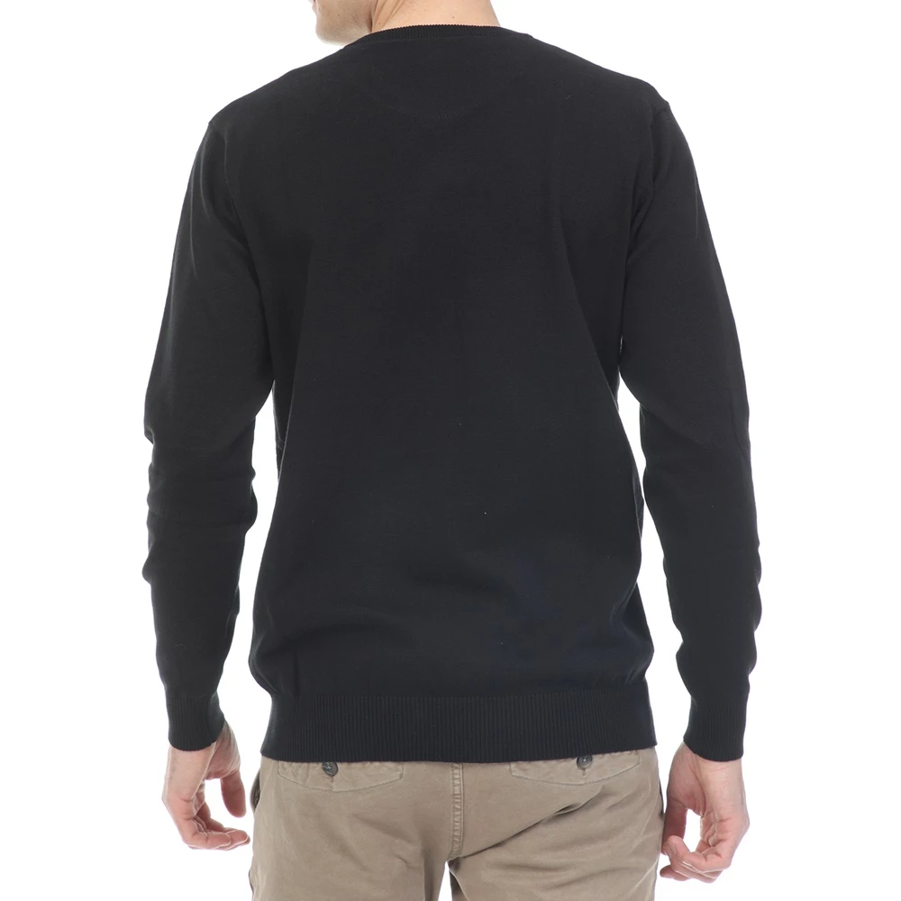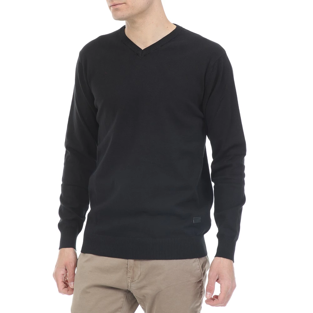 Ανδρικό πουλόβερ RUN σε μαύρο χρώμα. Από βαμβακερή πλέξη, σε ίσια γραμμή. Έχει μακριά μανίκια και V λαιμόκοψη. Λάστιχο ριμπ στις μανσέτες και την βάση.
