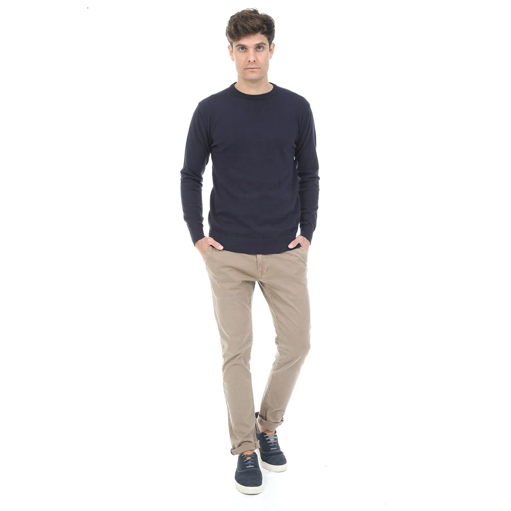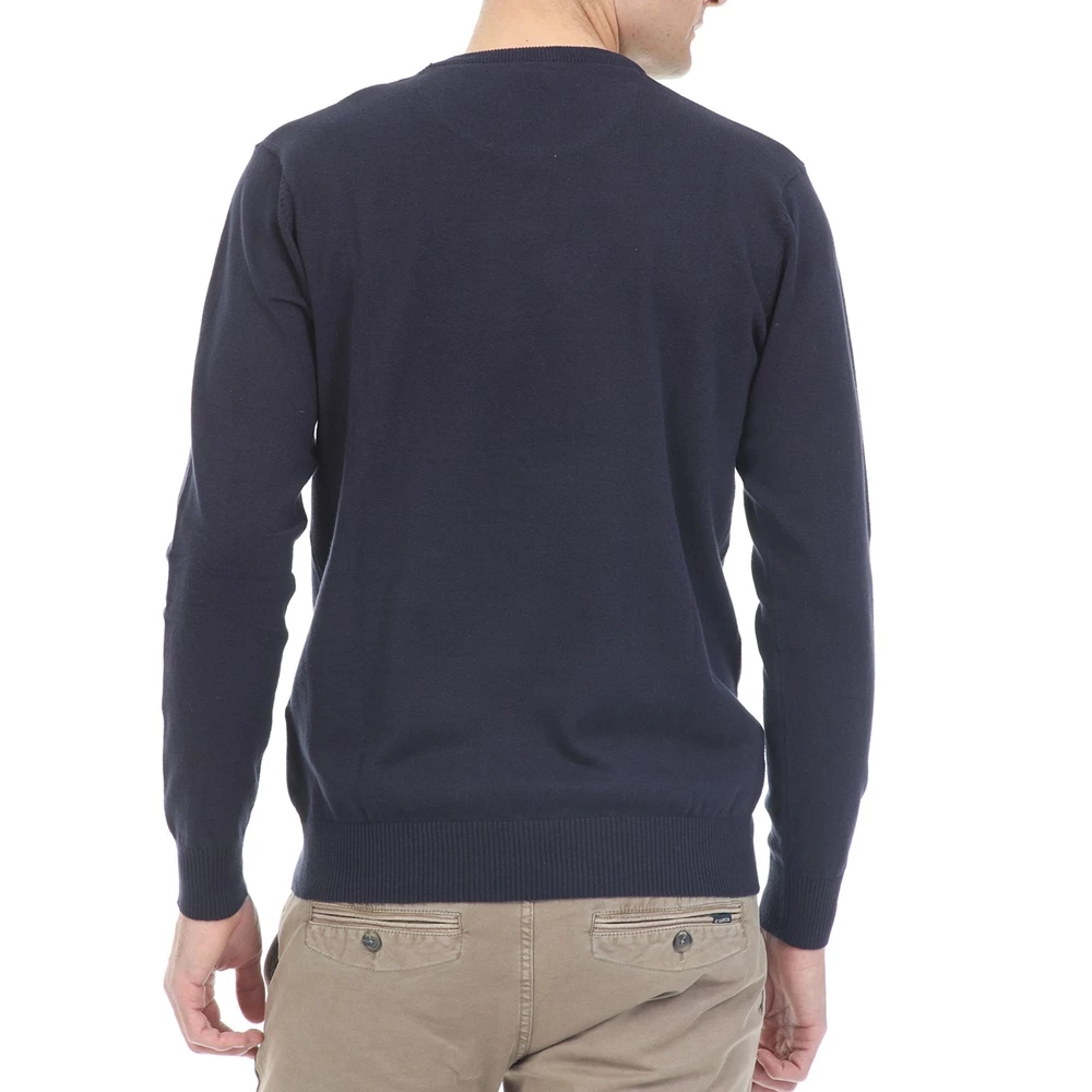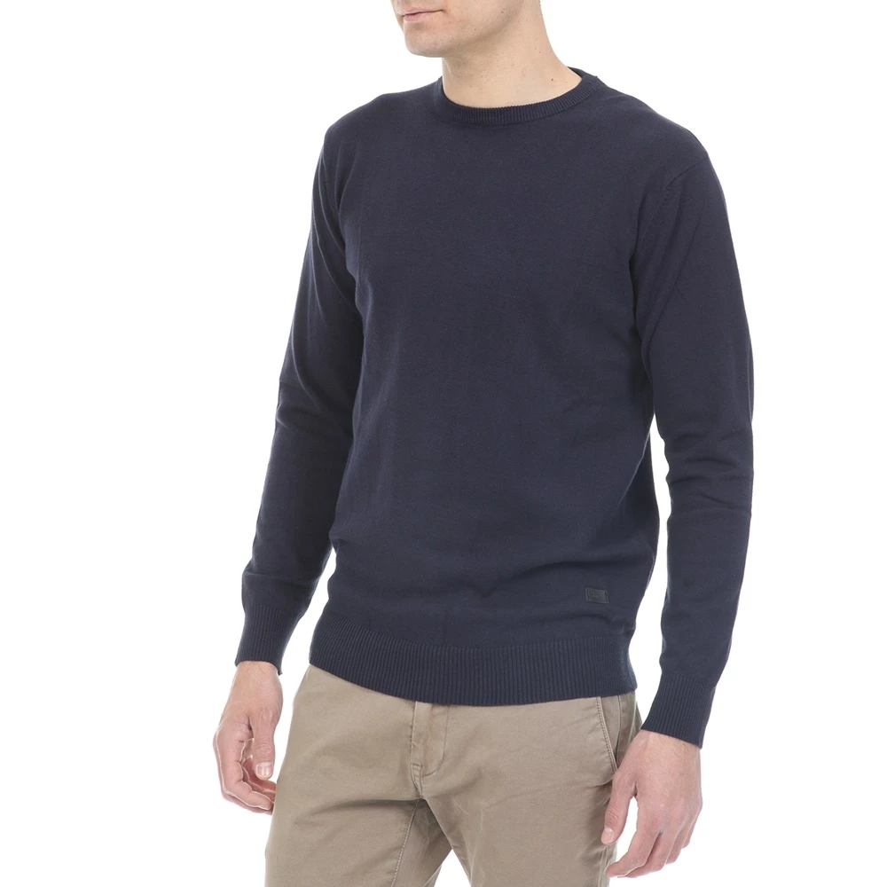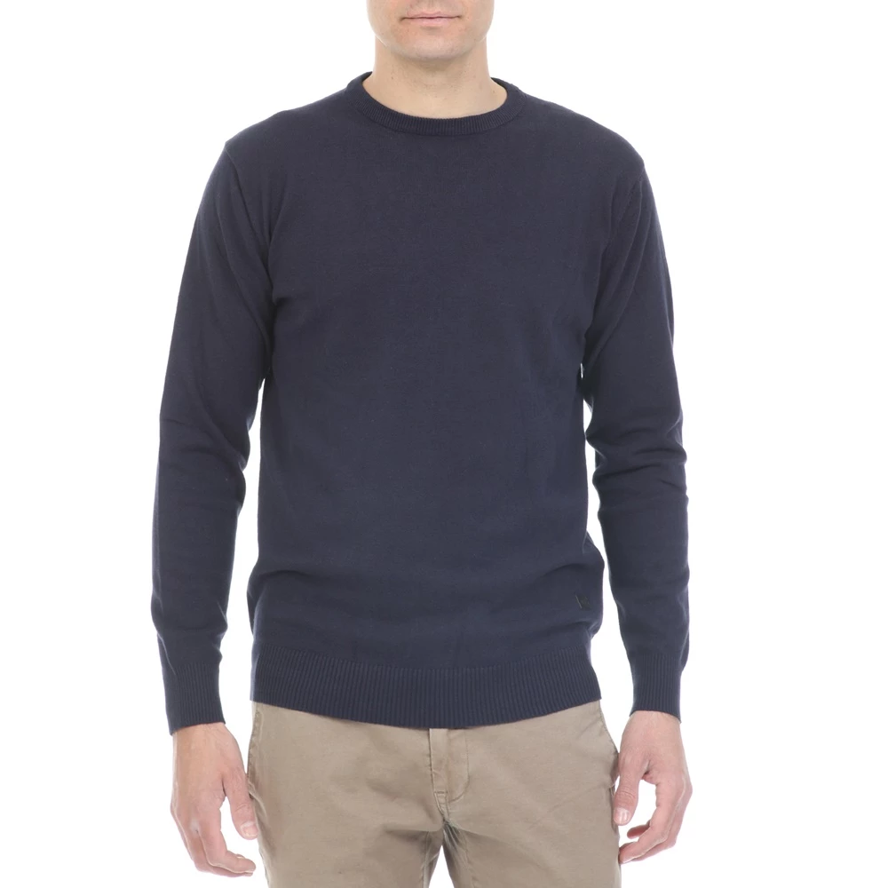 Ανδρικό πουλόβερ RUN σε μπλε απόχρωση. Από βαμβακερή πλέξη, σε ίσια γραμμή. Έχει μακριά μανίκια και στρογγυλή λαιμόκοψη. Λάστιχο ριμπ στις μανσέτες και την βάση.