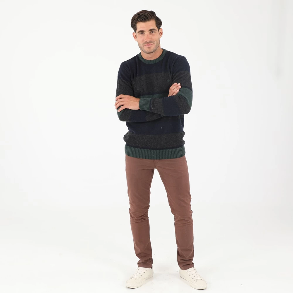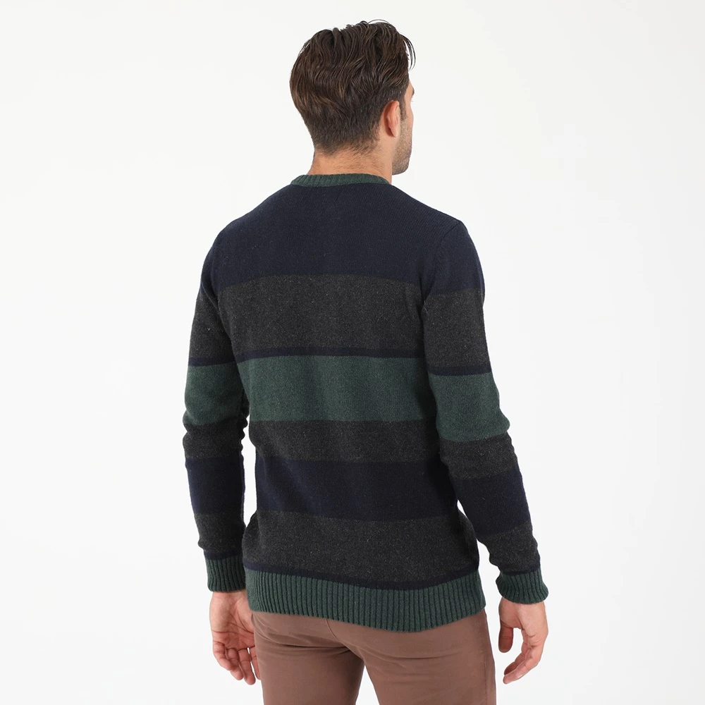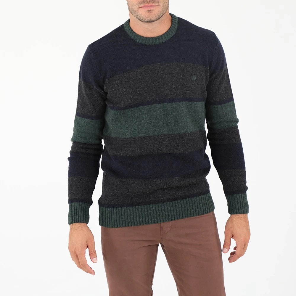 Ανδρικό ριγέ πουλόβερ DORS σε πράσινο και μπλε χρώμα. Έχει κλασσική εφαρμογή και στρογγυλή λαιμόκοψη. Ριμπ σχέδιο στη μανσέτα και στο τελείωμα.
