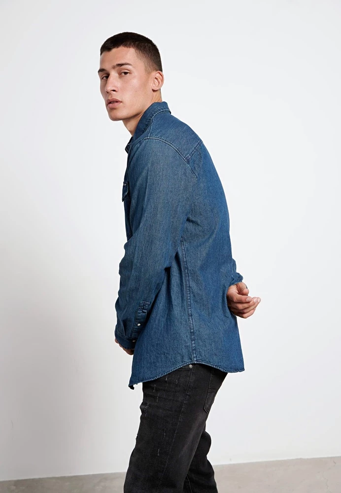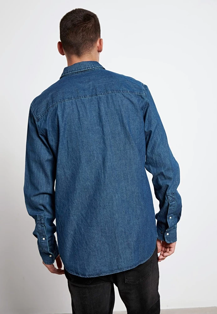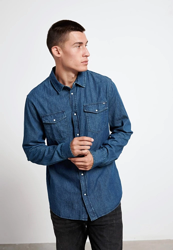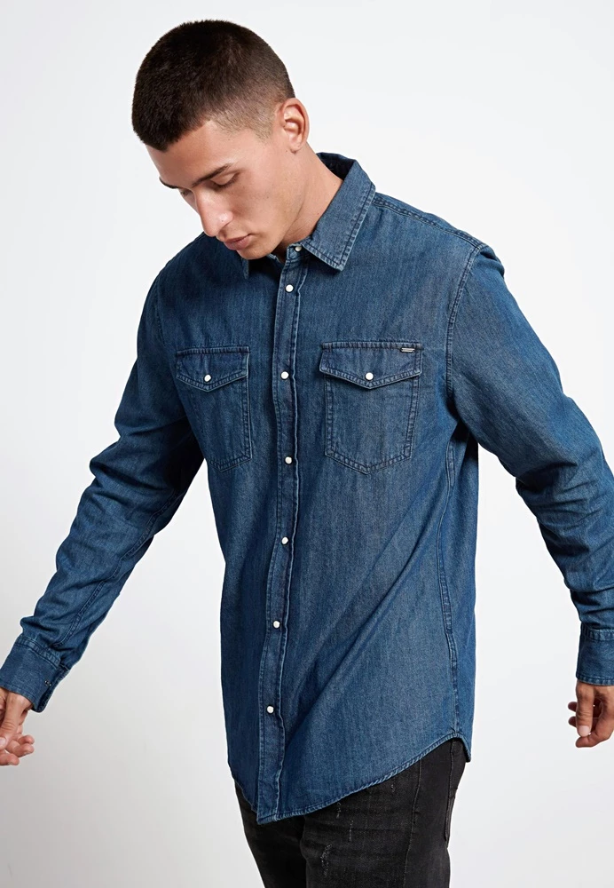 Ανδρικο μακρυμάνικο τζιν πουκάμισο FUNKY BUDDHA σε μπλε χρώμα.Έχει regular fit, δυο τσέπες στο στήθος, κλσσικό γιακά και κλείνει μπροστά με κουμπιά snap.